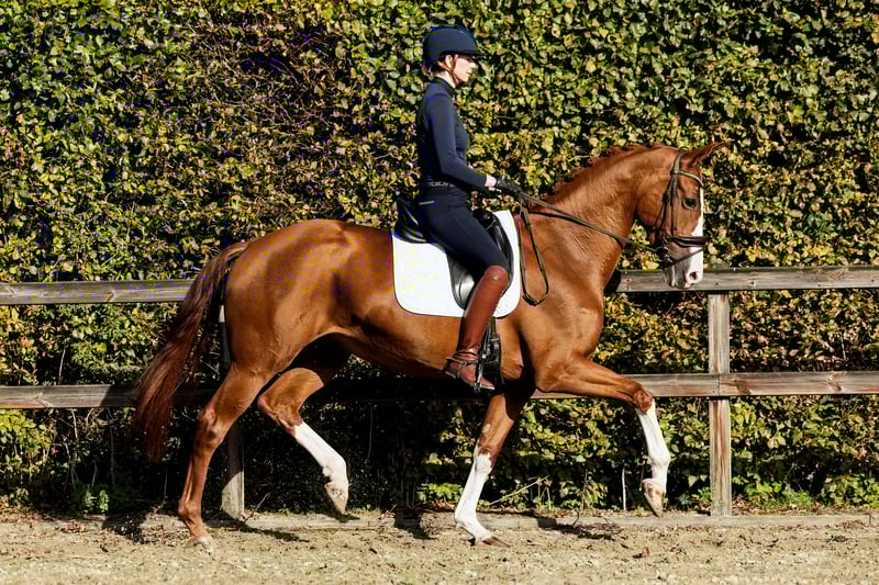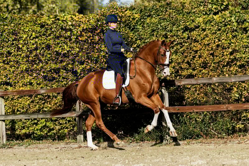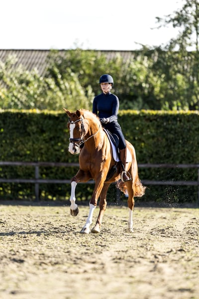 Six-year-old mare that stands out! Ouzo effortlessly passed her IBOP test, scoring an 8 for movement, an 8 for canter, and an 8 for posture. She also achieves high scores in competitions. She knows the exercises of M-level dressage and is already performing a green flying change. She has an incredibly pleasant temperament, making her suitable for all types of riders. This is a horse that will bring you a lot of joy. Her dam, Vieux, holds the Elite title and was successful at Z2 level. With her exceptional pedigree, Ouzo is also a highly interesting prospect for breeding (both now and in the future), with a low inbreeding coefficient of just 1.5%.