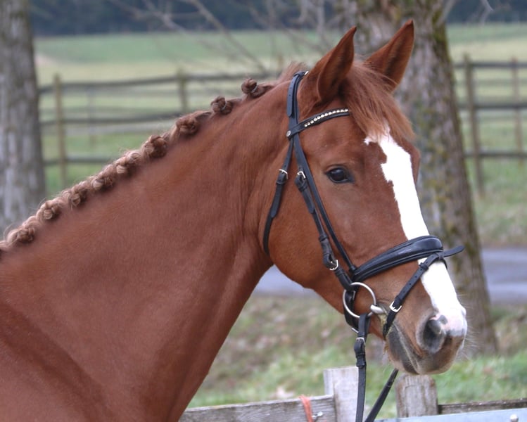 The athletic and long-legged mare Olana demonstrates a high level of quality over fences. She was initially used for breeding and was carefully introduced to sport. At six years old, she was competed up to class L by a 15-year-old rider. Although she still shows some greeness, she is well-behaved.