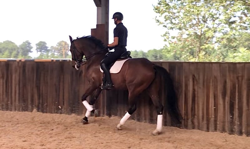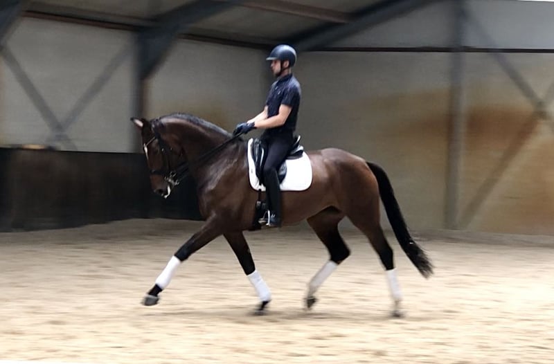 This 6-year-old mare is directly from the breeder. Trained up to M level. Working pirouettes in training. Good with the farrier and during transport. Light on the leg. Works in a snaffle and double bridle. X-rays available from when she was 3 years old. She is not spooky. For more information, please feel free to contact by phone or email.