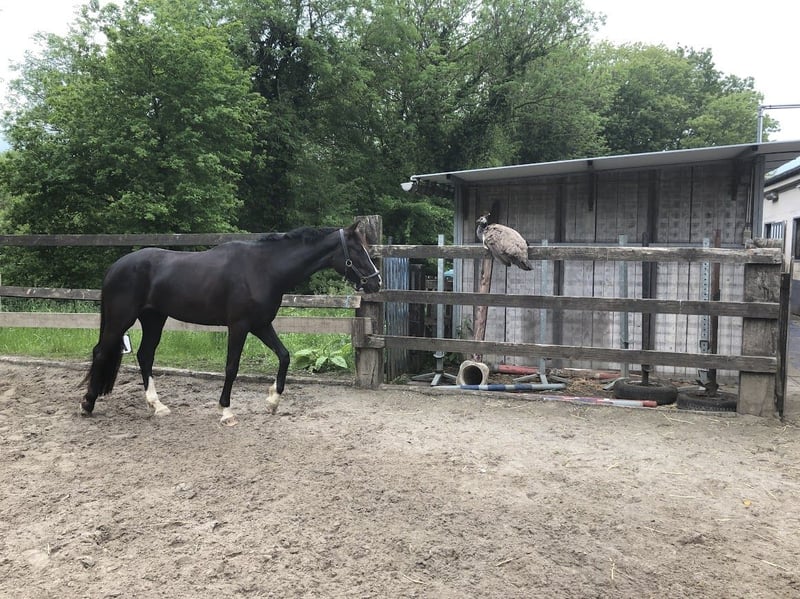 Schöne Fuchsstute mit hervorragender Abstammung. Beherrscht die Übungen bis Z, wurde jährlich für den nationalen Championat (LRV + junge Pferde) ausgewählt. Besonders hervorgehoben wurde sie durch ihr Gleichgewicht und ihre Veranlagung zum Sammeln. Mit 3 Jahren vollständig röntgenologisch untersucht und klinisch ohne Befund. Zudem verfügt sie über ein OCD-Gutachten. Sie ist absolut nicht schreckhaft, macht gerne Spong, Spaziergänge in der Gruppe und alleine, auch durch Wasser etc. Einfach im Umgang und sehr menschenbezogen. Steht bei uns in der Herde draußen. Aufgrund eines Weideunfalls (Sturz) kann sie nicht mehr geritten werden. Während der Rehabilitation arbeitete sie 6 Monate lang an der Longe (auch mit Schleppe) im Kutschfahrzeug ohne Probleme. Sie kennt alle Dressurübungen an der Longe und in der Hand. Derzeit ist sie voll belegt (war beim ersten Mal schnell ausgebucht), das Fohlen bleibt bei uns. Die Stute kann nach Absetzen abgegeben werden. Sie kann bei uns erneut gedeckt werden. Verkauft wegen Überzahl. Nur an eine gute, artgerechte Heimat, kein Händler.