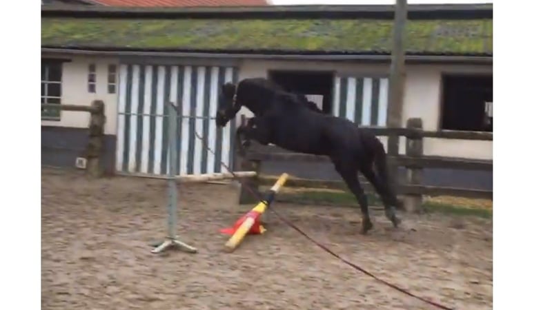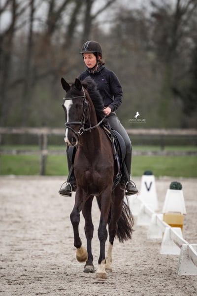 Leuke fokmerrie met goede afstamming. Beheerst de oefeningen tot Z, was elk jaar geselecteerd voor nationaal kampioenschap (LRV + jonge paarden). Blonk vooral uit door evenwicht en aanleg tot verzamelen. Op 3 jaar volledig RX en klinisch gekeurd zonder opmerking. Heeft ook een OCD predikaat. Absoluut niet kijkerig, maakte graag een spong, wandelen in groep en alleen, door water etc. Eenvoudig in de omgang en erg mensgericht. Staat bij ons in de kudde buiten. KAN NA WEIDE ACCIDENT (val) NIET MEER BEREDEN WORDEN. Werkte tijdens revalidatie 6 maanden in tuig aan de lange lijnen (ook met sleep) zonder problemen. Kent aan de lange lijnen en in de hand alle dressuuroefeningen. Momenteel vol (was vlot van eerste keer vol), het veulen blijft bij ons. De merrie kan weg na het spenen. Kan bij ons opnieuw gedekt worden. Weg wegens overtal. Enkel naar een goede thuis, geen handelaar.