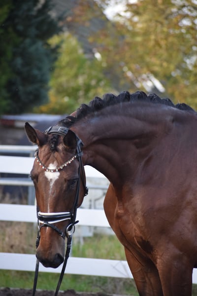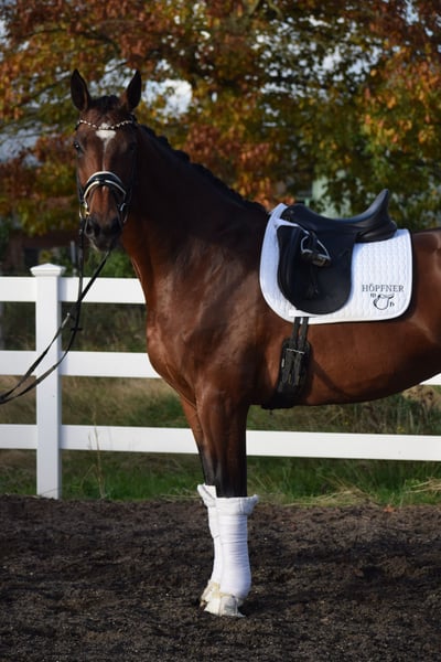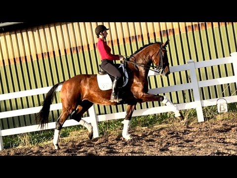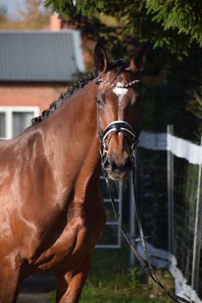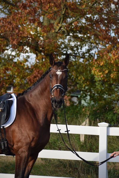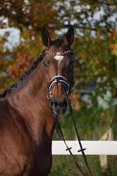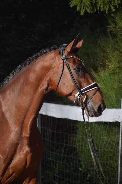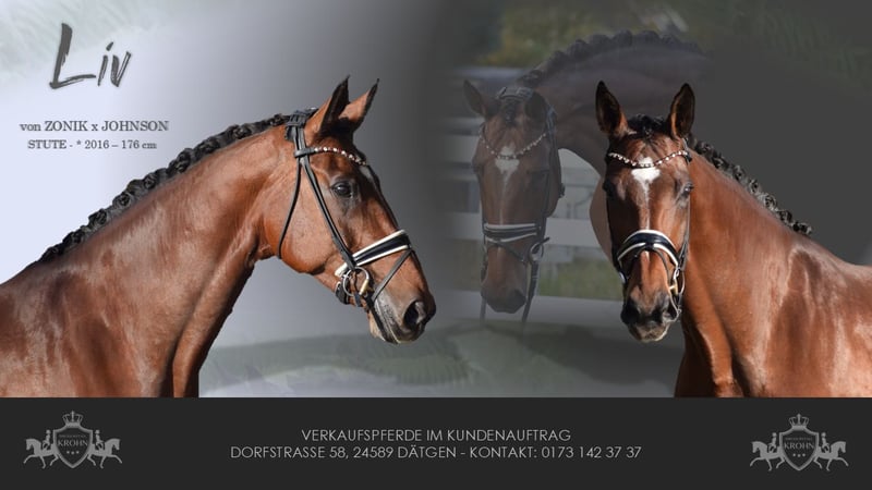 BEEINDRUCKEND SCHÖNE UND LEICHTRITTIGE DRESSURSTUTE, DIE MIT VIEL TYP UND GANG, IMPOSANT DAS GROSSE VIERECK FÜLLT - Junioren geeignet! Zum sofort Lostreiten! Zum Verkauf steht in Vertretung des Besitzers diese talentierte 9 j., braune, 176cm große, KWPN Stute der Extraklasse mit leistungsgeprägter Abstammung von ZONIK x JOHNSON. "LIV" bereitet einem im Umgang und in der täglichen Arbeit immer Freude. Auch mit ihrer Optik weiß Sie zu imponieren, mit typvollem Gesicht, harmonischem Gebäude und wirklich tollem Seitenbild. "LIV" ist mit 6 Monaten bei Ihrem jetzigen Besitzer eingezogen und seid dem in seinem Besitz (Grand Prix Reiter). Sie wurde immer professionell Zuhause geritten. Aufgrund Ihrer modernen Abstammung, dem harmonische Gebäude, dem guten Interieur, ihrer Stutbuch 1 eintragung Oldenburg und Zeitmangel des Besitzers, wurde Sie zwei Jahre in der Zucht eingesetzt und brachte zwei sehr gelungene Fohlen. Sie ist jetzt wieder in Arbeit und die Tatsache, das Sie mit 9j. und zwei fohlen, bereits alle M** Lektionen, sowie die meisten PSG & INTER I Lektionen beherrscht, beweißt Ihr hohes maß an Rittigkeit; Leistungs- und Ausbildungsbereitschaft. Setzt sich "LIV" in Bewegung, wird klar, hier zeigt sich eine leistungsbereite Sportler mit freude am großen Gang. "LIV" besticht unter dem Sattel durch Ihre auffällig schönes Seitenbild, mit guter Selbsthaltung und natürlicher Aufrichtung. Dadurch entwickelt Sie die Schwunghaften Gangarten toll ins Bergauf, mit viel Elastizität, Schulterfreiheit und sehr gut heran geschlossener Hinterhand. Ihre feine Anlehnung und gute Rückentätigkeit machen es dem Reiter leicht, "LIV" mit feinen Hilfen zu bedienen. Wer also ein Pferd mit großer Perspektive, aber auch eine richtige FREUNDIN FÜRS LEBEN sucht, die für jeden Spaß zu haben ist, der ist bei "LIV" genau richtig. Ob im Viereck, auf der Galoppbahn, oder im Gelände, mit "LIV" hat man pure Freude. Durch ihre hohe Kooperationsbereitschaft, Rittikeit und ihrem absolut ehrlichen Charakter ist sie auch Junioren / Junge Reiter geeignet. Eine echte gelegenheit ein tolles Pferd zu erwerben. Gerne kann "LIV" nach dem Kauf auch bei uns im professionellen Beritt verbleiben und auch auf Turnier vorgestellt werden. Ein aktueller, klinischer und röntgenologischer (Standart + Rücken + Hals), sporttauglicher TÜV liegt vor.