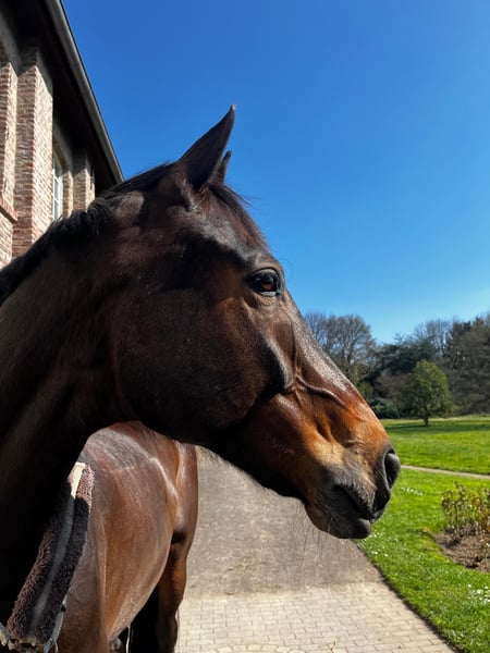 Dressage horse / Vaulting horse 9-year-old gelding, 1.73m with very good basic gaits. Goes bravely out on trails (even past cows!), excellent with groundwork (can be wrapped in a tarp) and loves to cuddle!!! Good for the farrier and loading, very well-mannered. Knows all-day turnout with geldings, but has also been in the pasture with a mare. Owner can no longer ride due to an accident! Location 51491 14.5 🥕