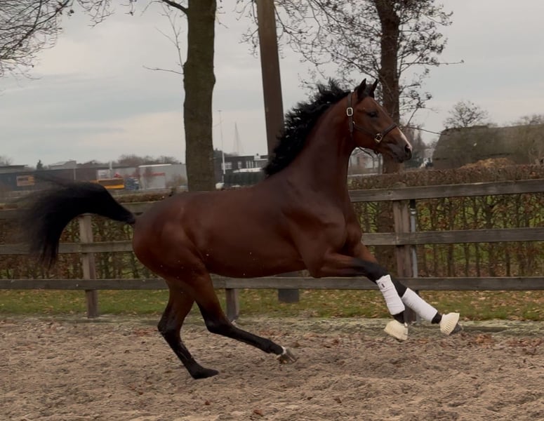 Highly talented young KWPN dressage stallion, directly from the breeder. A true eye-catcher with a wow factor, exhibiting a strong presence, an expressive head, and plenty of front. Correctly built with good legs and even feet. Moves with three fantastic gaits, very light on his feet, with beautiful technique and lots of impulsion in the legs. Strong hindleg and excellent balance. Hails from a very strong dam line; two full brothers of the dam compete at Grand Prix and Prix St. Georges level, respectively. Recently examined clinically and radiologically with no remarks!
