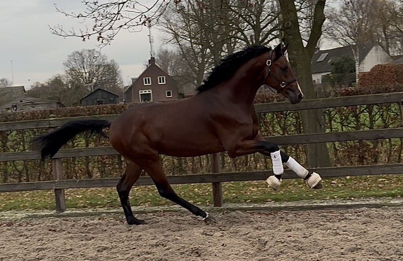 Zeer getalenteerde jonge KWPN dressuurhengst, recht van de fokker. Echte eyecatcher met een wow-factor, zeer veel uitstraling, aansprekend hoofd en veel front. Correct op de benen en gelijke voeten. Beweegt met 3 fantastische gangen, zeer lichtvoetig met een mooie techniek en veel tritt in de benen. Sterk achterbeen en veel balans. Komt uit een zeer goede moederlijn, 2 volle broers van de moeder lopen respectievelijk Grand Prix en Prix-st-georges. Recent klinisch en rontgenologisch gekeurd zonder bemerkingen!