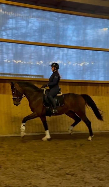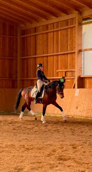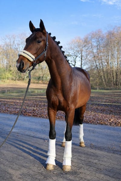Dieser vielversprechende 3-jährige KWPN-Hengst mit TOP Charakter präsentiert sich als herausragender Youngster mit besten Anlagen für den gehobenen Sport im großen Viereck. Absolut nicht hengstig mit besten Manieren. Der braune Sohn des Expectation aus einer Toto Jr-Mutter – und damit aus dem ersten Jahrgang des Expectation – überzeugt bereits jetzt mit seiner großzügigen Größe von 1,70m, seinem typvollen, sehr hübschen Exterieur und einer für sein Alter außergewöhnlich weit entwickelten Gesamterscheinung. Der Hengst entstammt einem leistungsstarken, sporterfolgreichen Mutterstamm, was seine Perspektive für eine spätere Karriere im Dressursport zusätzlich unterstreicht. Drei durchweg sehr gute, ausdrucksstarke, taktreine und dynamische Grundgangarten runden sein Gesamtbild ab und lassen keinerlei Wünsche hinsichtlich seiner Bewegungsqualität offen. Auch gesundheitlich bietet er sehr gute Voraussetzungen: Ein aktueller klinischer und röntgenologischer TÜV liegt ohne große Auffälligkeiten vor. In der täglichen Arbeit zeigt er sich altersgemäß gefördert, wurde sorgfältig und korrekt anlongiert und meistert nun seine ersten Ritte in allen drei Gangarten frei unter dem Reiter. Er überzeugt dabei durchweg mit seinem absolut einwandfreien Charakter. Ein Jungpferd, das einfach Spaß macht. Er ist außergewöhnlich artig im Umgang, stets freundlich und gelassen und benimmt sich sowohl beim Schmied als auch beim Tierarzt vorbildlich. Ein junger Hengst mit exzellenter Abstammung, hervorragender Bewegungsqualität und bestem Interieur – ein echter Nachwuchssportler mit Zukunftspotenzial. Selbstverständlich kann er bei Bedarf auch bei uns gelegt und weiter ausgebildet werden. Wir suchen für diesen tollen Junghengst ein förderndes Zuhause in besten Händen. Wir freuen uns über nette Anfragen und können dann gerne einen Termin zum Kennenlernen vereinbaren. Mehr Informationen und Videos gerne auch via WhatsApp oder telefonisch unter +49 173 7359633