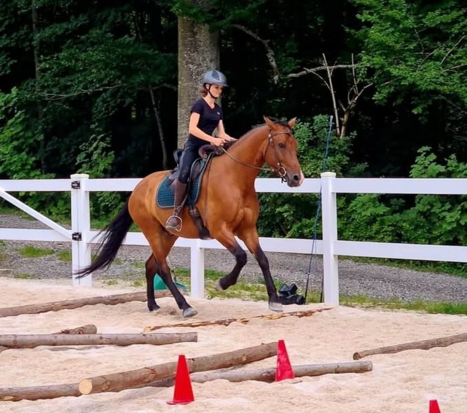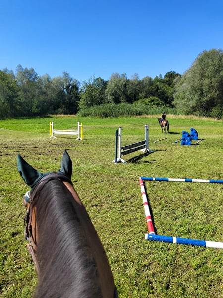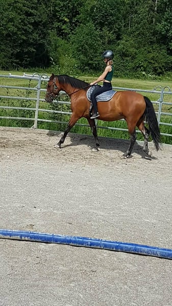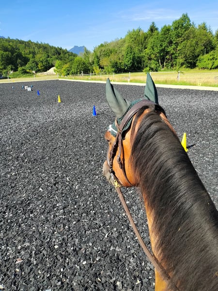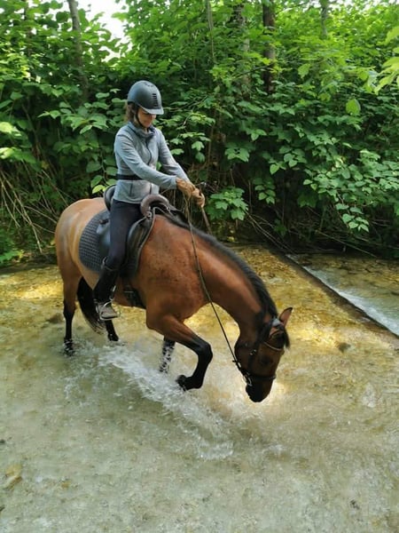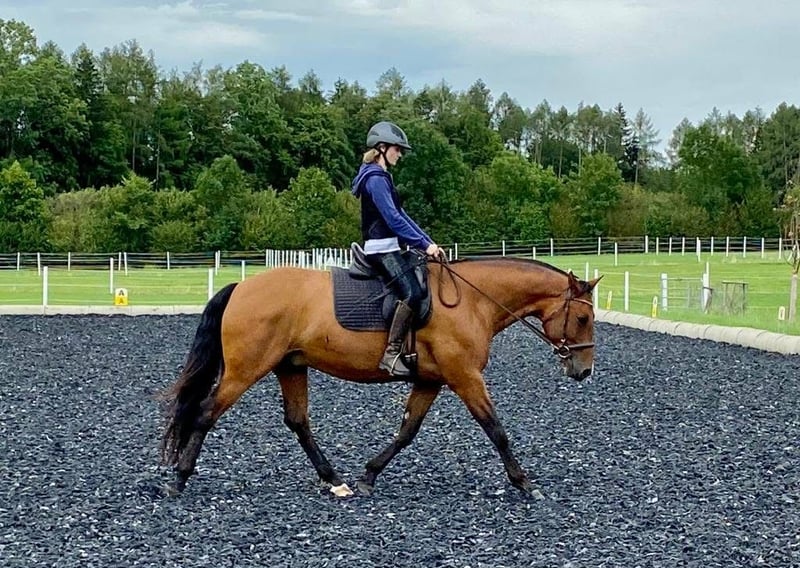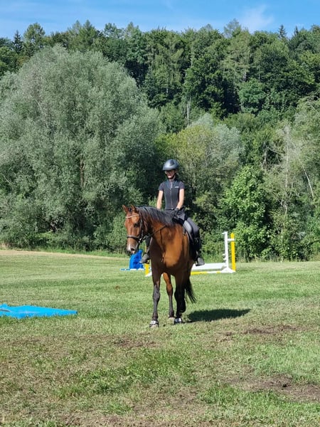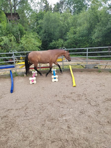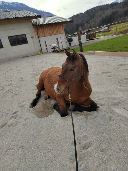 Er ist vielseitig gearbeitet worden, Dressur in der Bahn, kleine Sprünge auf der Springwiese und am Platz, (Frei-)Arbeit im Roundpen, Bodenarbeit, Zirkuslektionen, Ausritte (hauptsächlich zu zweit), Spaziergänge (auch alleine), Wandergaul und ab und zu Kurse sind ihm bekannt. Wir haben ihn mit 1,5 Jahren direkt vom Züchter übernommen, Lebenslauf ist lückenlos bekannt, Bilder sind bis ins Fohlenalter vorhanden (war Goldprämienfohlen). Er ist voll reitbar und war bei uns noch nie ernsthaft krank oder verletzt. Momentan ist er nicht voll im Training und wird nur ab und zu geritten.