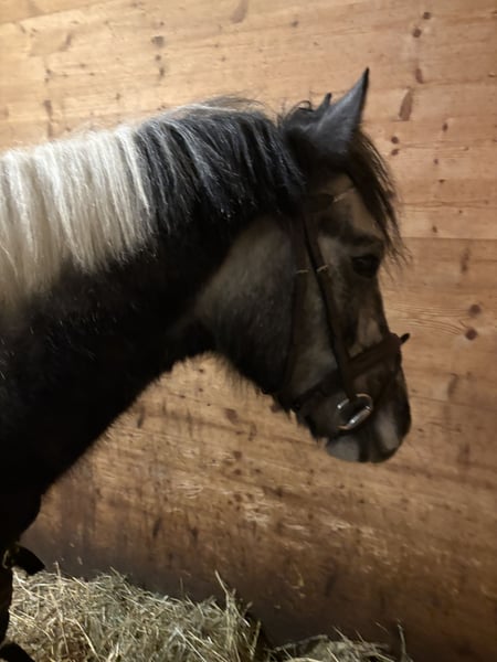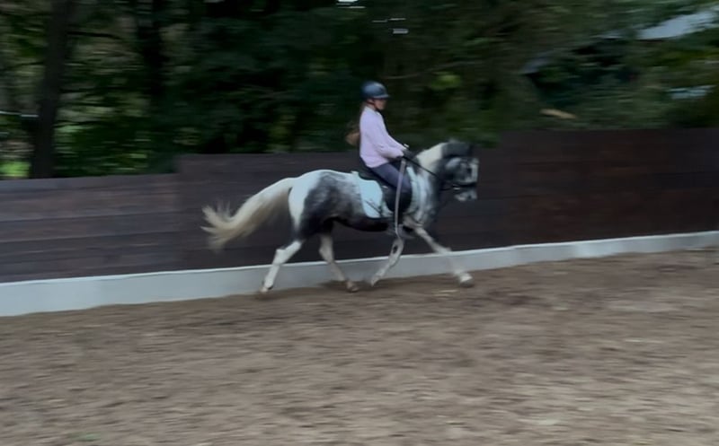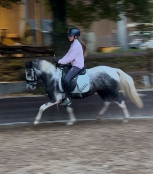 This charming pinto is well on its way to becoming a children's pony. Children aged 10 to 12 already ride him regularly. This year, he has also participated in small riding badge tests. With his excellent basic gaits, especially his trot, and a calm temperament, he promises to be a good competition pony up to A-B level. He enjoys jumping over poles and cavaletti and finds it very fun. He is fearless both in the arena and outdoors. Due to his age, he is suitable for beginners only when accompanied by a riding instructor or experienced parents. He is familiar with both open stable and box stall housing, including turnout on pasture. Children, dogs, and agricultural vehicles are no problem for him. He is open to new experiences, playful, and very quick. Please feel free to contact me if you're interested. We charge €25 for the pony introduction, which will be refunded upon purchase. No sales to riding schools.