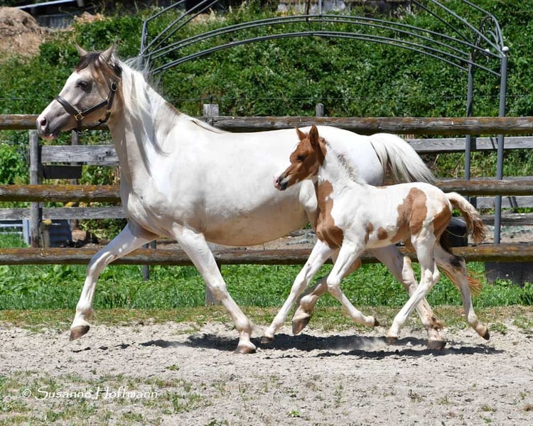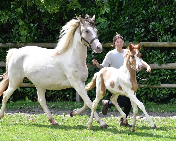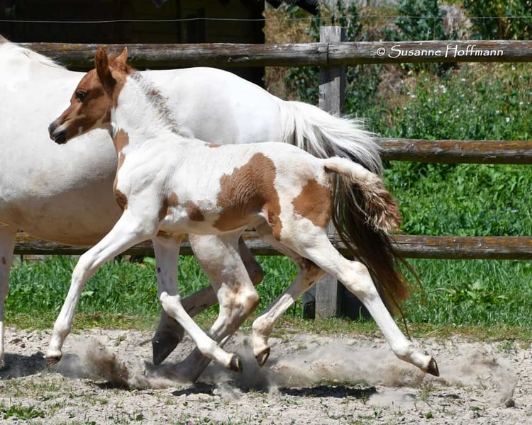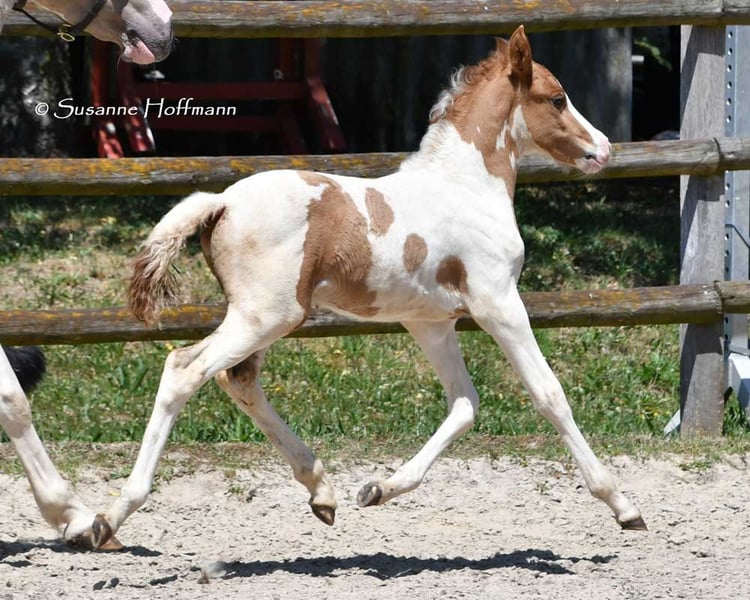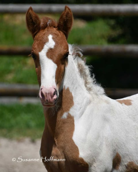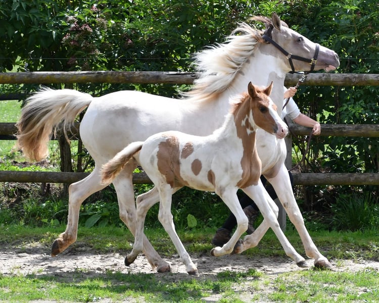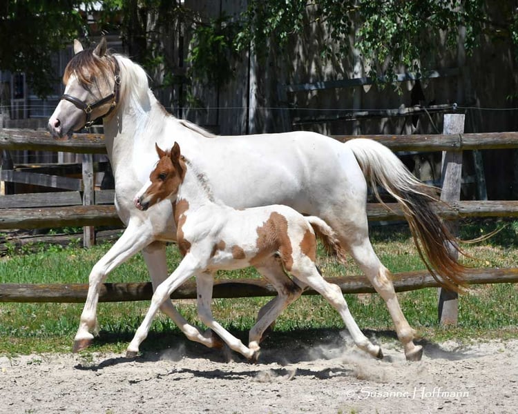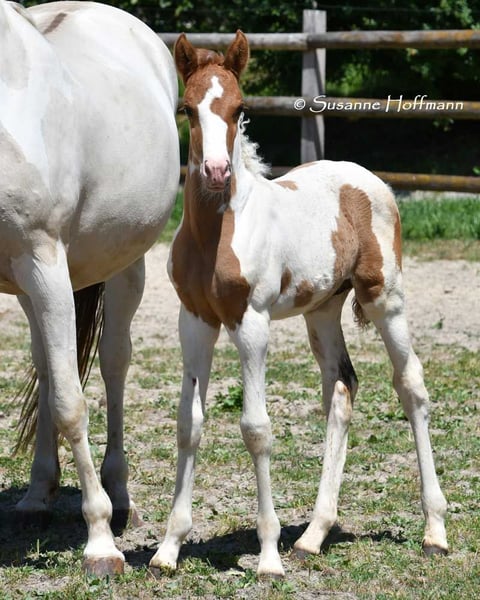 Our Salazar Sky was rated outstandingly at the inspection, including a perfect score of 10.0 for movement! He is predestined for a sporting career, as he possesses everything needed for success. He comes from very rideable, performance-oriented lines and already shows his tremendous movements at just a few days old (in the first photos). But he also impresses with his absolute calmness and is very people-oriented. By the way, Salazar is a chestnut pinto! Following this are three photos from the inspection. His father can be seen in the next photos, and he already stood out during the licensing for his impressive jumping ability and is a performance stallion. His father is also a performance stallion and a federal champion stallion, and his full sister is a federal champion mare, both from our breeding. Salazar's mother received the highest registration scores in her year, including a 9 for type and for trot. Her father is the performance stallion Heartbreaker, who you can see in the last photos. Her mother is a direct daughter of Dark Dancer, arguably the only Lewitzer with successes in dressage up to class S** against warmbloods.