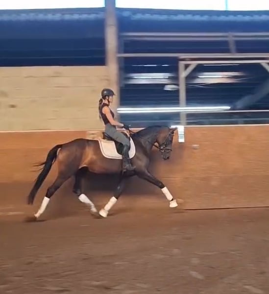 Feldfranzi is a very sweet mare with three above-average basic gaits and an excellent attitude towards work. Her trot is very expressive, and in the walk, she covers two steps with ease. Additionally, she is a very elastic horse and, although still at the beginning of her training, she already shows a calm and composed demeanor. Franzi responds very well to aids, has a refined mouth, and is always very willing to work. We could also see her as a family horse or as a mother/daughter pair. Franzi is ready for her first dressage competitions. Her pedigree also makes her very interesting for breeding. Directly from the breeder. Farrier- and load-in friendly.