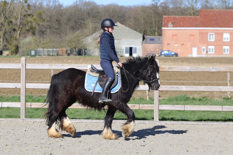 Dolly is a stunning jet-black Tinker mare, four years old and approximately 1.33 meters tall. She has a beautiful, well-built physique and is a real eye-catcher. Under saddle, Dolly is a sweet and calm pony that is easy to handle. She is well-versed in the three gaits and rides pleasantly. She will not buck or accelerate unnecessarily, making her a reliable partner under the saddle. Dolly also enjoys going on walks, both alone and in a group, remaining well-behaved and relaxed. She gets along well with other ponies and also loves to jump. In short, she is a lovely and dependable pony with a golden character. More info? +32 475 68 22 43 Videos are available on our website.