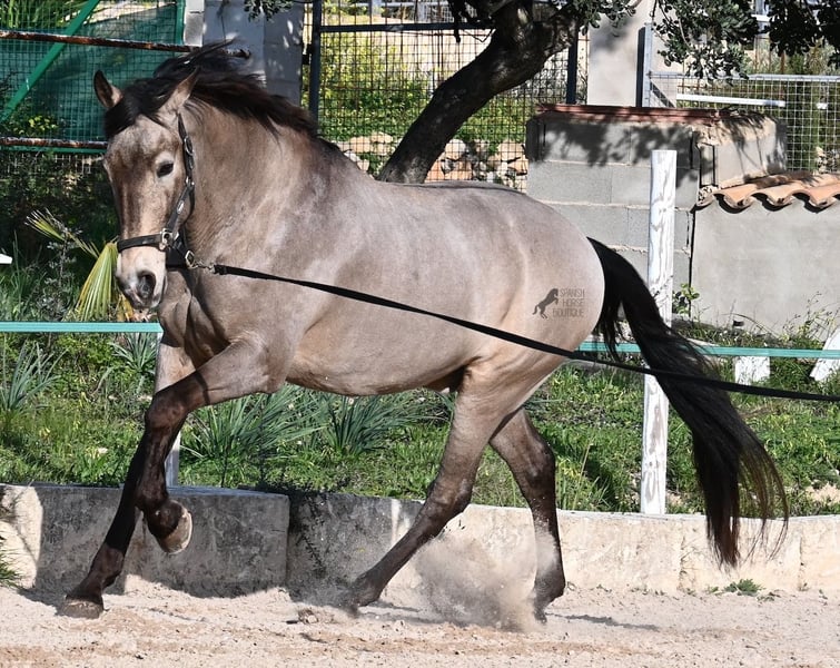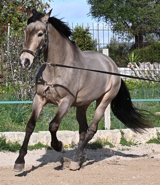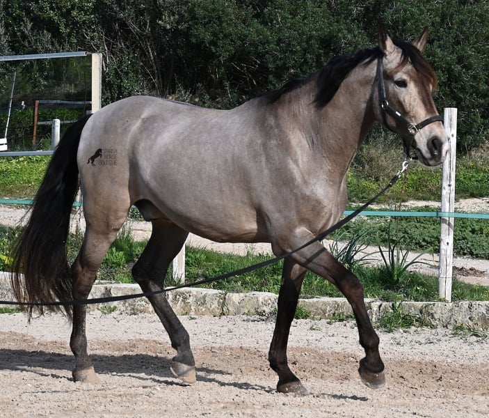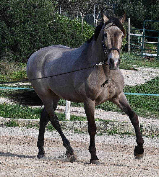 This 2010 born dun (currently in winter shearing, hence the gray color), is a mix of Lusitano and KWPN. He and his owner have been very successful in the dressage arena and have placed several times! Lateral movements, flying changes, canter pirouettes - all a piece of cake for this gelding. He also enjoys going into the field and even parades, such as the traditional animal consecration, with loud music and crowds of people, don't bother him! He is a real treasure to handle, a real protector and gentleman who never takes a wrong step or makes a wrong move. On the lunge he runs like clockwork, responds really well to voice commands and is also clever, because it was very windy at the photo shoot and he had his ears set to aerodynamics ;) Under saddle he WANTS to work and really blossoms. So he is a horse for someone who encourages him and works him 5 times a week, because the two performance breeds in his blood want to be kept busy. It is better to work him 7 times a week than only twice, which is why he is not really suitable for casual leisure riding. As a show professional, he is also easy to load, knows how to be in new places and in his summer dress he is also a real treasure on the outside (photos available). He has also been shown at shows by teenagers with riding experience and behaved well - but they were also kids who can really control his gas ;) He has been a gelding for a long time, so he could easily be integrated into a mixed herd. A fun horse for ambitious riders in his prime! He is currently on Mallorca! Videos and pedigree available on request. I would be happy to organize an AKU, riding, transport or even your trip if you come to see him in person. Details can be found on my website or in conversation. Saludos from Spain