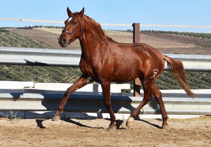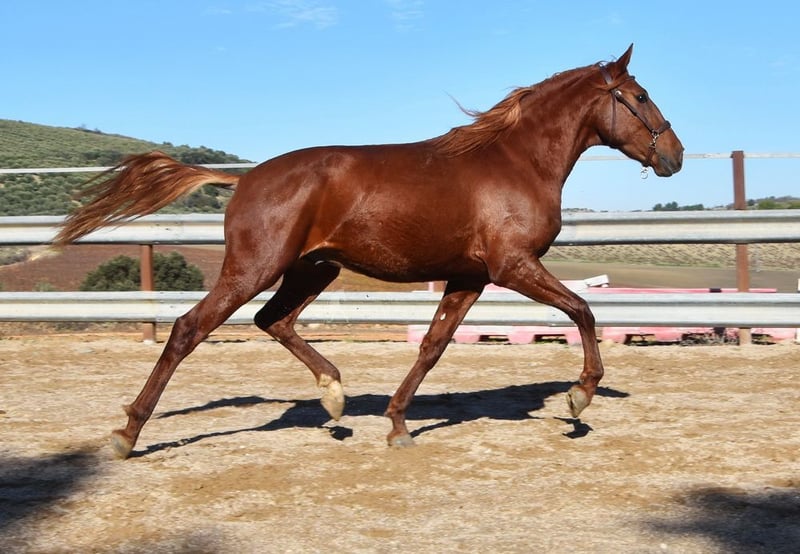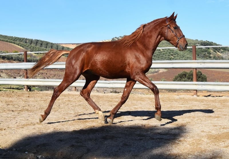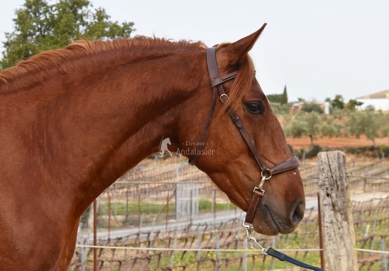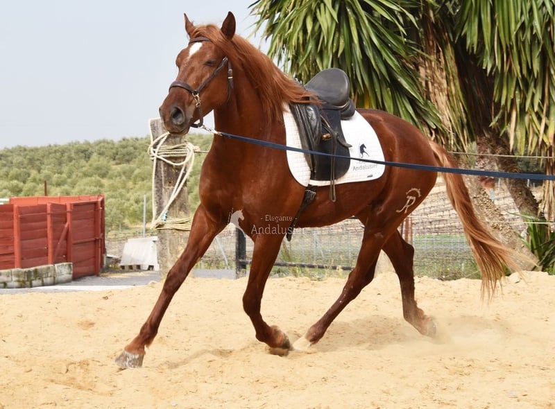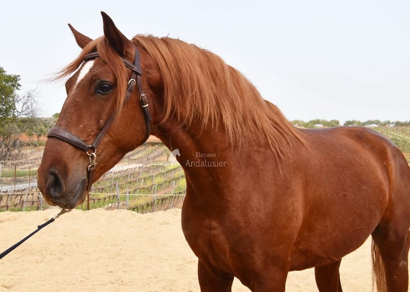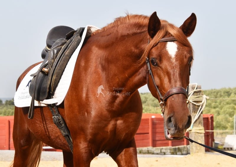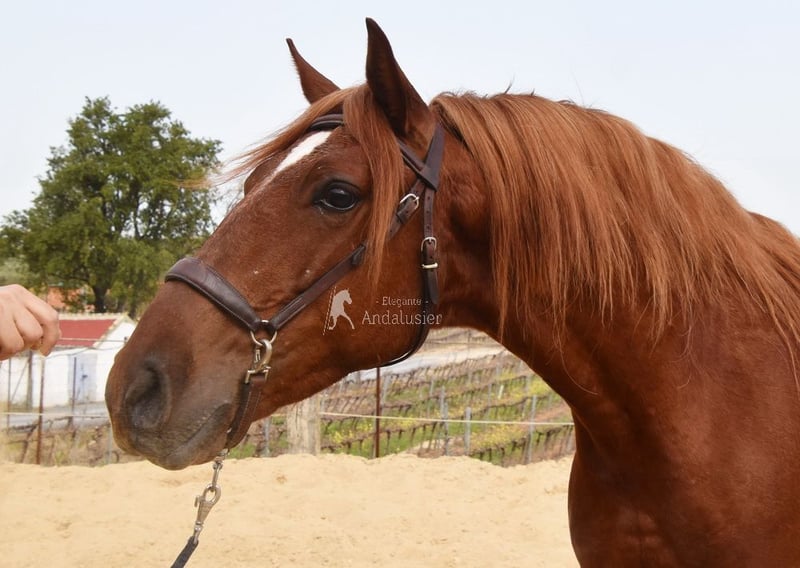 Handsome, classical Lusitano gelding in a chestnut coat, currently being ridden.