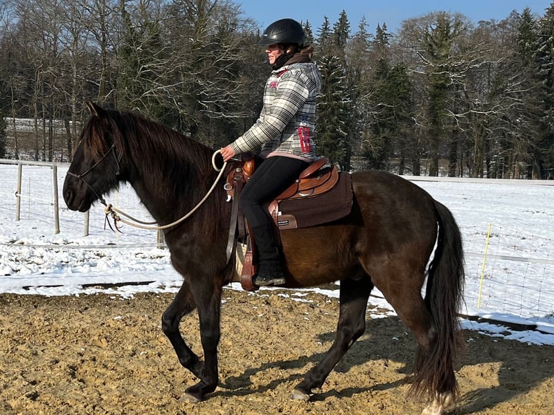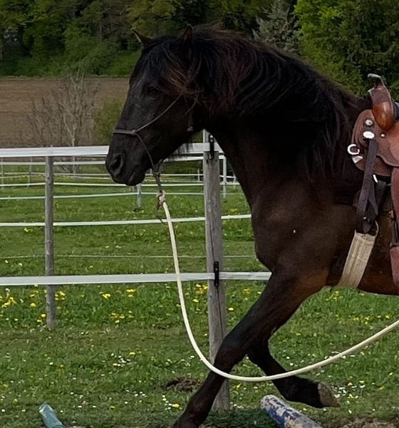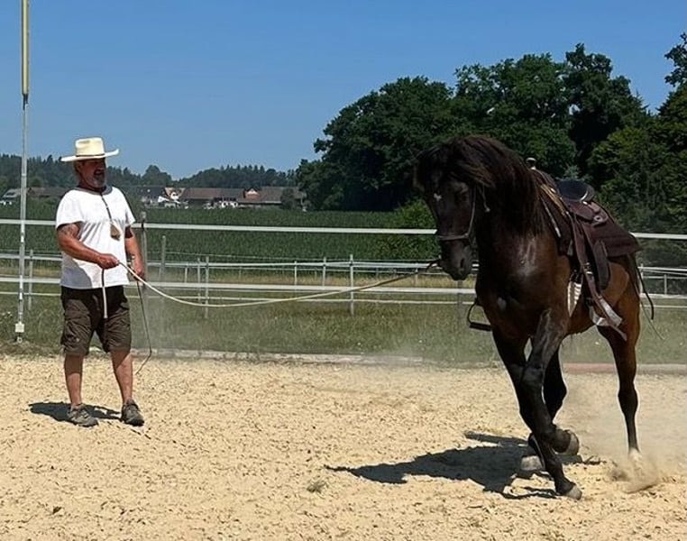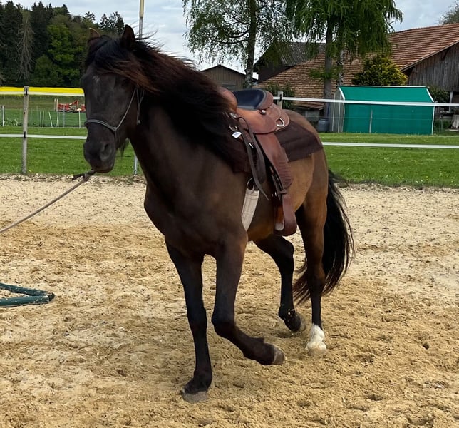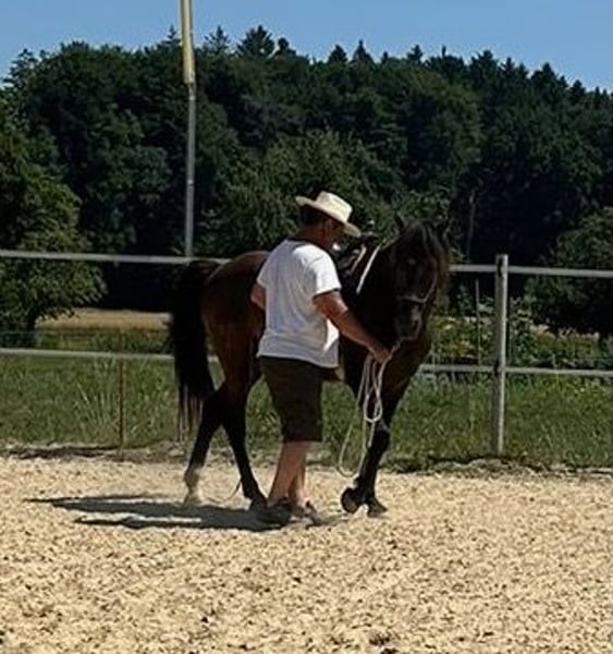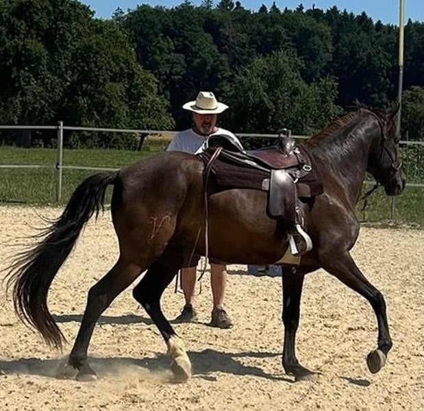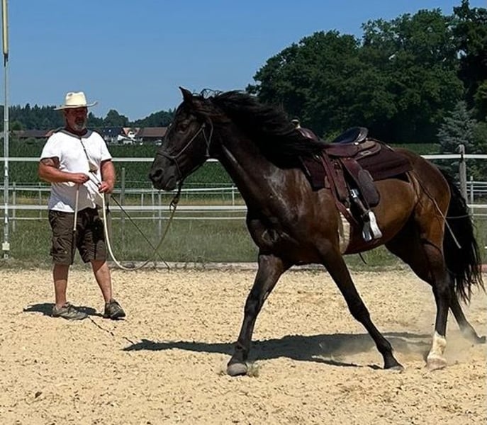 Traumhaft schöner und ausdrucksstarker Lusitano Wallach. Mit seinen 5 Jahren ist er schon ein Kraftpaket und weiss zu beeindrucken. Kompakt, wendig und stark aus der Hinterhand zeigt er dass viel Potential vorhanden ist. Selbstbewusst und eher in Hengstmanier kommt er gut alleine klar, seine Position will er akzeptiert und geschätzt wissen, geht aber mit konsequenter und klarer Führung gut um. Er wird zur Zeit in allen GGA angeritten und erstaunt unter dem Sattel mit seiner vorsichtigen und feinen Art. In der Natur spazieren, vom Boden aus arbeiten, verladen oder auch Hindernissetraining absolviert er schon sehr gut und willig, zeigt auch dass er Bewegung und Abwechslung liebt. Maron gehört in erfahrene und sanfte Hände mit Ambitionen, er ist kein Pferd für Anfänger oder reine Freizeitreiter. Auch ist er nicht geeignet für eine Offenstallhaltung, braucht aber sicher eine Aussenboxe und viel Auslauf.