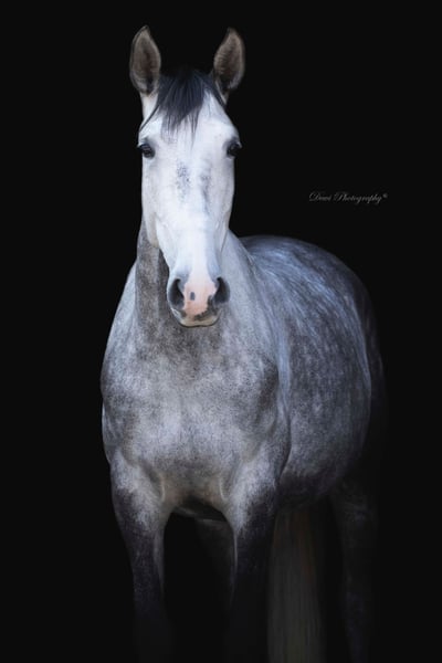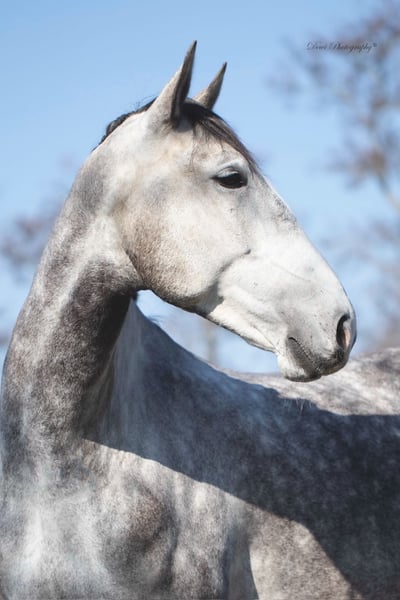 6-jähriger (geboren am 16. April 2020) PSL-Schimmel-Wallach. Stockmaß ca. 1,67 m. Abstammung: Epico das Figueiras x Renovado.