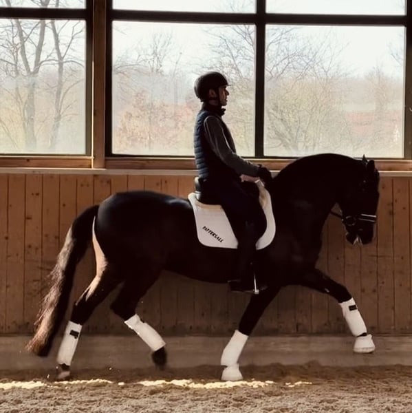Un jeune Lusitano d’une exceptionnelle morphologie, qui a déjà fait ses preuves dès ses premiers pas. Avant son importation en Allemagne, il a été sacré vainqueur des chevaux de 4 ans en Équitation de Travail au Portugal. Ce poulain talentueux se distingue par une grande facilité de dressage et une forte volonté de travailler. Ses mouvements sont empreints d’une élégance naturelle : un trot expressif, associé à un galop monté avec un bon rebond, de qualité. Un cheval prometteur pour les cavaliers ambitieux – talent, attitude et charisme se combinent ici pour former un partenaire d’avenir très intéressant, tant pour la compétition que pour l’éducation.