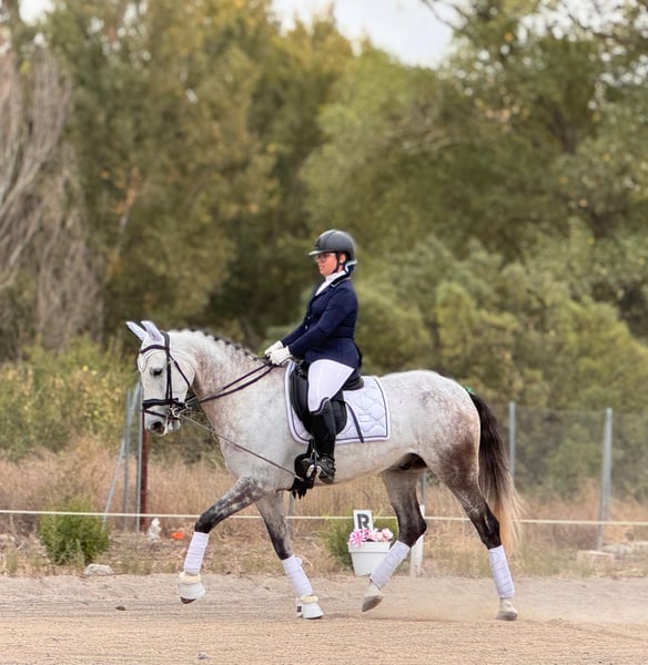**Lusitano castrado, entrenado en doma Caballo Lusitano, castrado, nacido en 2018, con facilidad para aprender nuevos ejercicios y mucha energia. Con una alzada de aproximadamente 165 cm, este tordo rodado no pasa desapercibido en pista. Este ejemplar ha sido entrenado en doma clásica, demostrando una actitud asustadiza pero inteligente, por lo que no es apto para jinetes sin experiencia en el deporte. Su temperamento en box/prado es equilibrado y confiable. Salud apta para el deporte, consultar para mas información