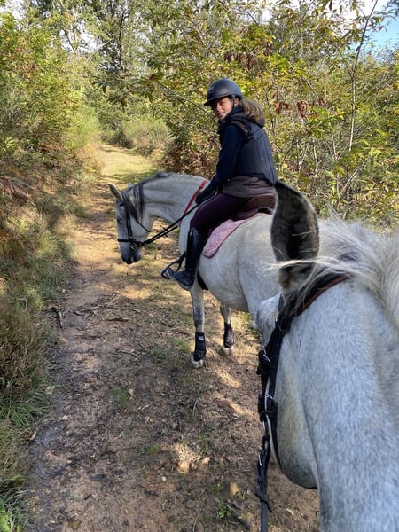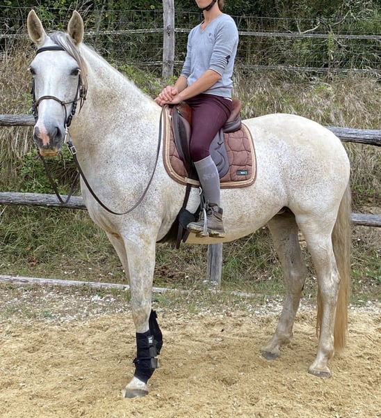 Alizée de La Goudelie is een zachte, goed gebouwde merrie, 1.65m groot, die werkt in de arena en buiten in de lage school (drie gangen, tweesporen oefeningen, boerderij tot boerderij). Opgeleid met een basis in ethologie. Leeft in een kudde met haar zussen en soortgenoten in de wei met schuilstal. Tandarts OK, twee of drie keer per jaar ontwormd. Zijn vader was gekwalificeerd in dressuur op Saint Georges niveau en in springen (zie foto op de harasdelagoudelie.com website). Zijn moeder heeft Veiga-bloed in haar afstamming, wat hem levendigheid geeft met een vrij stabiel karakter. De getoonde prijs is exclusief BTW en in Frankrijk moet een BTW van 10% worden toegevoegd als de verkoop voor fokdoeleinden is, of 20% als de verkoop voor vrijetijdsdoeleinden is.