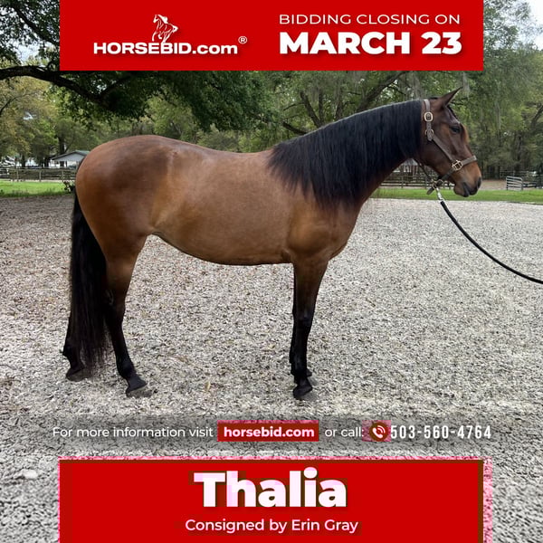 ⚜️𝓽𝓱𝓮 𝐆𝐎𝐋𝐃 𝓢𝓮𝓵𝓮𝓬𝓽⚜️ Happening now thru MONDAY | MARCH 23rd - Available EXCLUSIVELY on HorseBid's website! For more details and to register visit: www.Horsebid.com CONSIGNOR CONTACT: Erin Gray - text only 503-560-4764 LOCATION: Ocala , FL BREED: Lusitano REGISTERED: Yes REGISTERED NAME: Thalia COLOR: Bay HEIGHT: 15.2 AGE: 3 GENDER: Mare ✨ 2023 Bay Lusitano Mare “Thalia” ✨ Double Registered: ASPL & USLA Step into the world of Portuguese equestrian excellence with Thalia, a stunning young Lusitano mare now available in an exclusive online auction. Blending heritage, athleticism, and intelligence, Thalia embodies the classical beauty of the Iberian horse while offering the talent and trainability to take her rider in any direction. Thalia is a statuesque example of the old Baroque Lusitano type—a look that is increasingly rare to find today. With her elegant presence, expressive movement, and uphill build, she captures attention wherever she goes. Athletic, fluid, and naturally balanced, Thalia loves to GO! She has forward energy paired with an easily manageable temperament, making her a joy to ride. Her smooth, effortless gaits and willingness to work make her an exciting prospect for dressage, working equitation, or any discipline you choose. Wise beyond her years and a delight to have in the barn, Thalia truly enjoys being doted over. She is affectionate, people-oriented, and forms deep bonds with her handler. Her kind nature and trainable mind reflect the wonderful temperament Iberian mares are known for. Elite Bloodlines Thalia comes from exceptional imported lineage. Her sire was imported from Brazil to the United States and is a Grand Prix Champion, contributing athletic ability and proven performance genetics. Her pedigree includes renowned Lusitano lines such as Flash, Halconero, and Quarteto do Top, bringing together power, elegance, and proven sport talent. Training Thalia currently has 60 days under saddle and is continuing her education. • 30 days of basic dressage training with a Gold Medalist FDE Grand Prix dressage trainer • Forward, willing, and highly trainable • Ready to continue in the discipline of your choice Her fresh start makes her an ideal partner for someone who wants to shape a talented young Lusitano into their dream horse. Key Details • Breed: Lusitano • Year: 2023 • Color: Bay • Sex: Mare • Registry: Double Registered – ASPL & USLA • Training: 60 days under saddle / 30 days professional dressage training Why Thalia Stands Out Elegant & Athletic Cadenced, balanced gaits with the classic Portuguese style that turns heads in the arena. Versatile Talent Ideal prospect for dressage, working equitation, classical riding, or a versatile sport partner. Intelligent & Trainable Quick learner who responds beautifully and thrives with consistent riding. Bold Yet Kind Temperament Forward and energetic while remaining sensible, affectionate, and easy to manage. A Living Heritage Owning a Lusitano means becoming part of centuries of Portuguese equestrian tradition. Ground Manners & Care Thalia is a pleasure to handle and live with. • Leads well • Cross-ties • Stands for the farrier • Bathes easily • Excellent hooves • Easy keeper She is a delight in the barn and loves attention, making her an ideal partner for both amateur and experienced riders. Included • Winter blanket • Full fly sheet The Opportunity Thalia is a rare opportunity to own a young Lusitano mare with elite Grand Prix bloodlines, excellent temperament, and enormous sport potential. Whether you envision dressage, working equitation, classical riding, or simply building a deep partnership, Thalia is ready to grow with you. She isn’t just a horse—she’s a partner, a performer, and a piece of living Lusitano history. Viewing available by appointment – she’s ready to impress in person. Bid now and bring home elegance, talent, and heart — your Lusitano partner awaits. 🐎✨ Please text only for more information on Thalia due to hearing impairment needs.