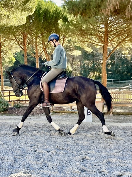 Serenata es una joven y elegante yegua lusitana de sangre pura, de color negro brillante, con una pequeña mancha blanca en la frente que recuerda a un copo de nieve. Gracias a su excelente estructura corporal, eclipsa a muchos sementales. Nació en nuestra finca (www.coudelaria-linda-oliveira.com) y ha disfrutado de su infancia y juventud en un grupo de manada, aprendiendo a la vez a relacionarse con las personas de manera cercana y afectuosa. Por ello, es una joven muy amable y sociable, que está en las primeras etapas de su carrera como caballo de doma. A los tres años y medio, ya está siendo montada, ha sido longada, trabajada en el suelo y recientemente ha comenzado a ser montada con suavidad. Nos impresiona por su afán de aprender y su disposición a cooperar. Es una verdadera joya que seguramente brillará, con una presencia imponente y destinada a ser una fiel compañera para su jinete. Por supuesto, todavía necesita tiempo en su entrenamiento, por lo que puede quedarse con nosotros para su formación básica. Ahora es una oportunidad de adquirir esta magnífica y elegante yegua lusitana de color negro, ya que no hay muchos caballos comparables. Su pedigrí resulta interesante también para la cría, ya que puede transmitir su codiciado y raro color negro en la raza lusitana. Su padre, Lidador OC, es un semental de 10 años, exitoso en el nivel de Gran Premio, de sangre pura y de origen noble. Su madre proviene de antiguas líneas de cría de toros de lidia. Sin duda, posee la valentía y la capacidad de recolección necesarias para la disciplina de la Working Equitation. Fue presentada con éxito a los dos años en el festival de yeguas jóvenes en Cascais. Para más vídeos e información, no dude en contactarnos por WhatsApp al +49 17644482124.