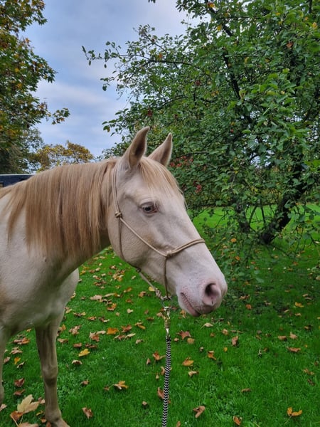 Wunderschöne cremello-Stute mit blauen Augen. Sehr lieb und verschmust. Sie kann sowohl für den Freizeit- als auch für den Western-Reitsport genutzt werden. Momentan wird sie hier im Western geritten. Außerdem ist sie als Zuchtstute geeignet. Sie ist sensibel auf die Hilfen und kann gut mit einem Führstrickhalfter geritten werden. Sie ist gut vorwärts geritten und reagiert auch gut auf die Bremse. Sie ist jetzt seit 1,5 Jahren unter dem Sattel, ist aber noch etwas grün. Sie ist lernwillig und nimmt neue Dinge sehr schnell auf. Sie freut sich auf die Arbeit und möchte alles richtig machen. Sie ist klug, sensibel und mutig. Beim Spaziergang ist sie an den Straßenverkehr gewöhnt, da wir an einer vielbefahrenen Straße wohnen. Sie ist äußerst brav im Umgang mit den Hufen, diese werden natürlich regelmäßig ausgekratzt. Auch die Anfahrt im Hänger bereitet kein Problem. Sie steht hier 24/7 draußen in einer kleinen Herde und erhält ausschließlich Heu. Leider muss sie aufgrund von Platzmangel dringend abgegeben werden, daher der niedrige Preis!