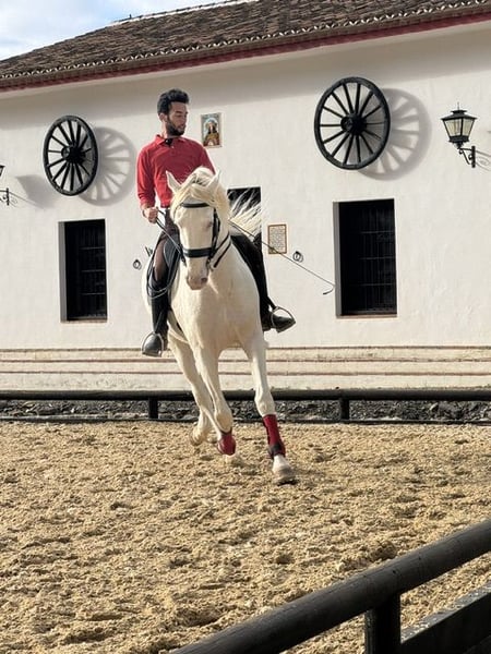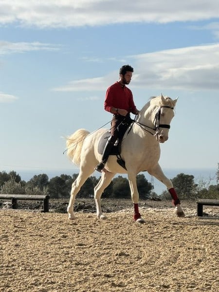 Galhito jest ze mną od jego drugiego roku życia i jest wytrenowany do wysokiego poziomu. Ma w sobie krew walki byka, dlatego wyróżnia się swoją wrażliwością. Bez problemu dostosowuje się do poziomu jeździeckiego swojego opiekuna. To skarb wśród koni, który posiada również dużą zdolność do pracy na ziemi. Ponieważ w Hiszpanii rozwijam hodowlę koni Lusitanos i Lusowarmblood, Galhito jest dostępny do obejrzenia w Maladze.