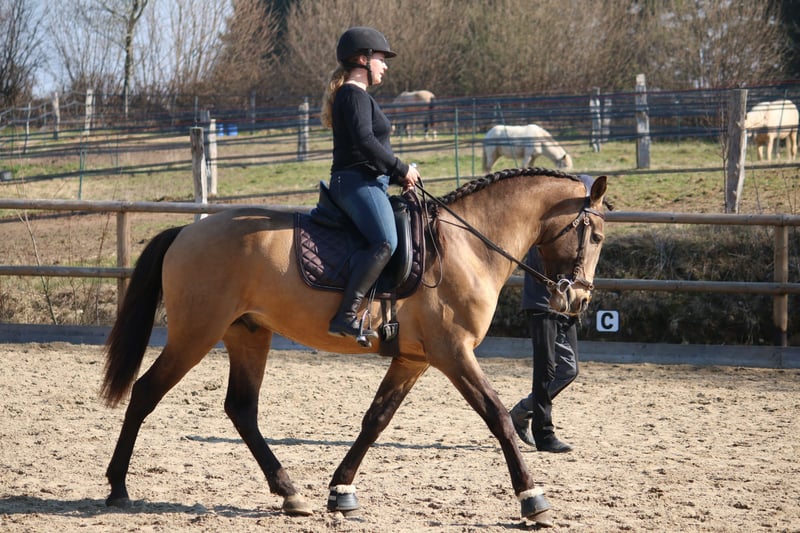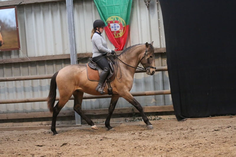 Salgado ist ein derzeit 162cm großer PSL Hengst in der Farbe Buckskin. Er hat unglaublich viel Ausdruck und zieht die Blicke auf sich. Mit grossrahmigen Bewegungen und schon jetzt einer schönen bergauf Galoppade macht er im Viereck eine gute Figur und wird dort sicher glänzen. Auch die ersten Male auf dem Working Equitation Platz hat er sich talentiert gezeigt. Er ist ein ruhiges und dem Menschen sehr zugewandtes Pferd, wie die Lusitanos eben so sind! Er ist jetzt seit ca 5 Monaten unterm Sattel. Wir haben ihn schonend mit Pad und Gebisslos angeritten. Jetzt geht es an die Arbeit. Er hat viel Spaß an der Arbeit und ist fleißig! Er steht bei uns derzeit 24/7 draußen und steht mit Wallachen und einem Ponyhengst zusammen. Er lässt sich verladen und läuft barhuf. Bei weiteren Fragen meldet euch gerne bei mir. Videos folgen in Kürze!