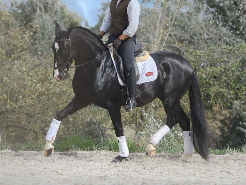 Impressive black baroque horse of typical beauty and noble character. His solid morphology together with his good bloodlines, he is descendant of the Ortigao Costa line, make of this beautiful stallion a horse with a very good head and easy to ride. With three correct gaits, it is worth mentioning his canter, comfortable, smooth and fluid to ride. His level of dressage corresponds to his age, he does lateral work in all three gaits and shows a receptive and enthusiastic attitude towards his rider, always eager to learn and to give the best of himself. Piro free and with a good veterinary check-up, we believe that this black beauty is a suitable horse for an amateur rider looking for a horse with good character and impressive beauty with which to continue to evolve at higher levels.