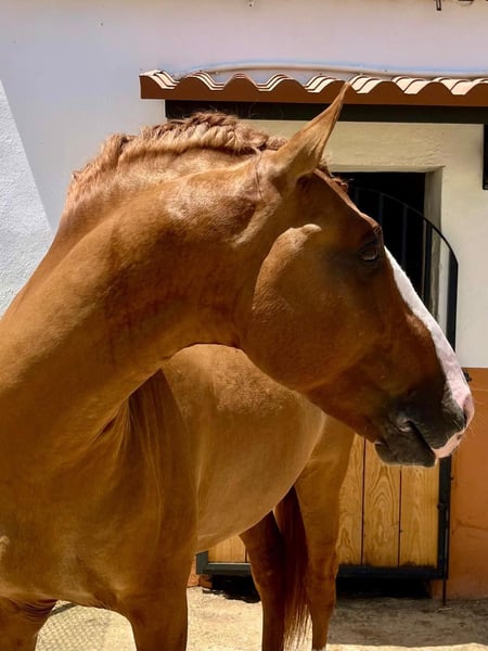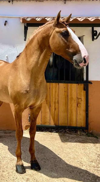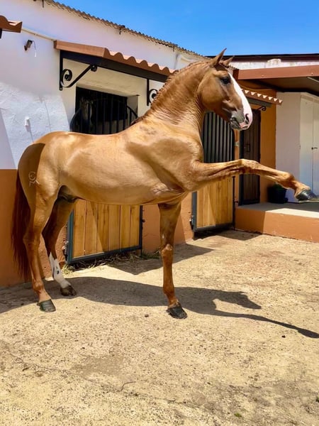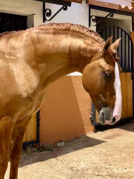 The golden horse 💛 Oro is a piro free 7yro Lusitano stallion with 165cm and a very rare colour genetic, he is a red dun and has full APSL papers. And not only his gold shimmery colour is standing out, his heart is also made out of gold. This horse has such a big heart and noble soul that you fall immediately in love with him. Friendly, calm, patient and very well educated. A complete dream. Absolutely safe and bombproof and a horse to enjoy. Oro is a perfect choice for working equitation, shows or classical dressage. He has normal movements. He is doing lateral work, flying changes, piaffe. He is located in Spain 🇪🇸 More informations over PM or WhatsApp 00491786997334. Jasmin from Top-Lusitanos🤗