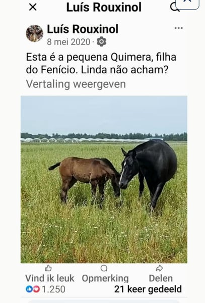 Te koop: ### 1. Hada Linda Sol Real https://www.allbreedpedigree.com/hada+linda+sol+real * Merrie, geboren in 2017 * Grullo * Ongeveer 1,60 m schofthoogte * Geregistreerde Spaanse Mustang * Afstamming: Sorraia x PRE APTA * Sensitief, maar vriendelijke aard, mensgericht * Goed onder het zadel * Heeft deze winter met de zadelmakheid begonnen * Goed te laden op trailer/wagen * Kan volledig bereden worden afgestaan * Heeft al 2 krachtige veulens gekregen * Interessant als fokmerrie Aangekocht voor €5000, van Emanuelle Gallouet, contract aanwezig. Ik mag wettelijk slechts 4 paarden houden en zoek een goed thuis voor 3 merries. Prijs €3750, bespreekbaar. ### 2. Quimera *Paspoort* * Merrie, geboren in 2021 * Smokey Black * Ongeveer 1,56 m schofthoogte * Lusitano * Veel temperament, mooie gangen * Eind 2025 met training begonnen * Heeft al een prachtige Cremello-zoon gekregen *Afstamming: Luis Rouxinol, Fader Feniçio SS, moeder zonder stamboom, was een Lusitano met Don Diego-stempel. Prijs €2750, bespreekbaar Una Des Templiers, Lusitano Veiga, 17 jaar, uiterst vriendelijke merrie, was vroeger bereden, maar na mijn ongeluk niet meer; moet weer in training worden gebracht. Het belangrijkste is dat ze weer wat wordt getraind. Deze merrie houdt van rust en voelt zich niet prettig in grote kuddes, ze is uiterst zachtaardig. Prijs vanwege haar leeftijd €1750, bespreekbaar, alleen voor een zeer goed thuis. ### Contact * Alleen via WhatsApp: **+32 456 76 55 05**