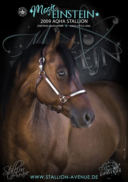 Magic ist ein bildhübscher Hengst mit exzellenter Abstammung und hervorragendem Interieur! Magics Charakter entspricht dem einzigartigen „Einstein-Charakter“: Absolut cool und unerschrocken, brav, rücksichtsvoll, anhänglich, menschenbezogen, sehr ruhig, verschmust, interessiert – einfach nur toll! Seine Bewegungen sind katzenhaft – sehr elegant und geschmeidig. Ihm zu zuschauen bereitet viel Freude. Sein Vater ist der weltberühmte „Einsteins Revolution“, der in den USA innerhalb kürzester Zeit herausragende Siege und gewaltige Gewinnsummen erlaufen hat. Seine Mutter hat mit „Hollywood Jac 86“, „Doc O Lena“, „Smart Little Lena“, „Gallo Del Cielo“, „Smart Chic Olena“, „Dolls Union Jac“ und „Jacs Little Lena“ großartige Vererber und Legenden in Ihrem Stammbaum. Am meisten freut es uns, dass Magic sein super Wesen an seine Fohlen weiter gibt!