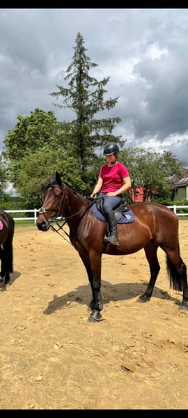 Na sprzedaż piękna, zadbana klacz małopolska, urodzona w 2014 roku. Wzrost 173 cm, gniada maść. Koń kuty na przód, wychodzący codziennie na pastwisko. Przyzwyczajony do samotnych terenów, psów oraz transportu. Koń dobry do skoków i WKKW. Klacz dużo potrafi i napewno mogłaby wprowadzić następnego jeźdźca w świat skoków i zawodów. Idealna dla osoby stabilnej w siodle, chcącej mieć dobrego konia na początek przygody z zawodami. Koń startował do konkursów klasy P włącznie, w domu naskakany do 120/125 cm. Stale w treningu, trudne kombinacje czy gimnastyki nie stanowią dla niej problemu. Chciałabym żeby Kobyłka przysłużyła się komuś tak jak mi i spełniała kolejne marzenia młodzieży 😉 Koń ma badania do wglądu