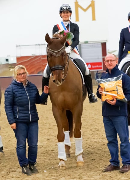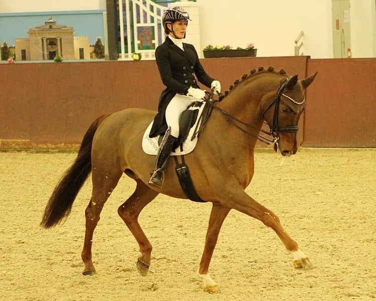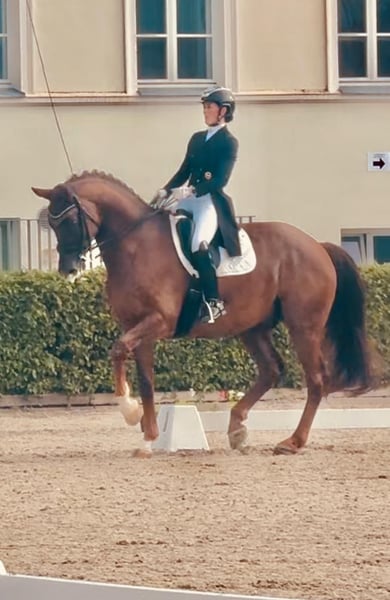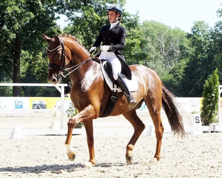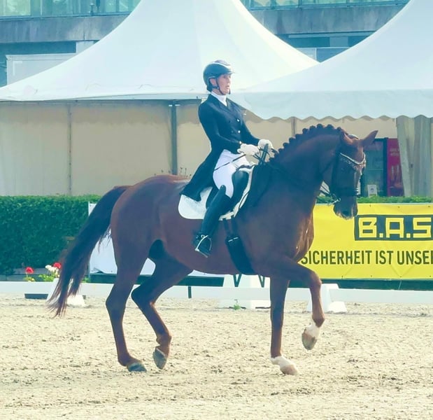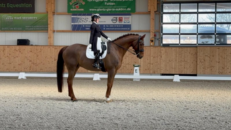 - Tall dark chestnut gelding with three outstanding basic gaits - Possesses talent and strength for collected movements - Easy to sit and pleasant to ride for ladies - Numerous wins and placings up to Dr. S **** level – Grand Prix placed - Silberglanz was born, raised, and gently trained at Ganschow Stud