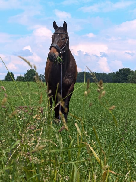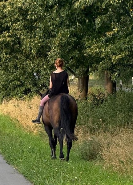 Verkaufe aus persönlichen Gründen meinen Mecklenburger Wallach Welentino (Rufname Willi). Eckdaten: 17 Jahre Ca. 175cm Regelmäßig entwurmt, geimpft und physiotherapeutisch behandelt Schmiedefromm, barhufer Geritten im Freizeitbereich, überwiegend im Gelände Kennt und bevorzugt Offenstallhaltung Ist rangmittig bis -niedrig Kennt reine Wallachherden aber auch geschlechtergemischte Herden Pass vorhanden Willi ist ein sehr menschenbezogenes Pferd, das Aufmerksamkeit, Streicheleinheiten und Nähe sucht und genießt. In Herden fügt er sich gut und ohne Probleme ein, unabhängig von Größe und Geschlechteraufteilung. Er wird überwiegend im Gelände geritten (in der Gruppe und alleine) und ist dabei straßensicher (kennt Traktoren, Autos, Hunde, Fahrradfahrer), hat auch schon zuverlässig Kinder getragen. Aufgrund seiner Größe und Kraft ist er jedoch nicht als Kinderpferd geeignet! Er benötigt vor allem alleine im Gelände eine gute und sichere Bindung zu seinem Reiter. Eine Mischung aus Durchsetzungsvermögen, Fairness, Vertrauen und liebevoller Konsequenz ist bei ihm wichtig. Bodenarbeit, Longieren und auch das Reiten auf dem Platz kennt er - favorisiert allerdings deutlich Ausritte. Ich suche für ihn ein dauerhaftes Zuhause, in dem er die Liebe und Aufmerksamkeit bekommt, die er verdient. Willi nimmt sein Zubehör (Sattel, Trense, Decken,..) mit in sein neues Zuhause. Keine Händler!