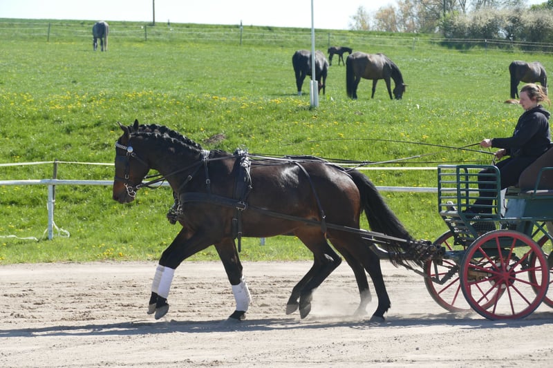 Monsun: - Moderner Reitpferdetyp in dunkler Jacke - Mit ausgezeichnetem Interieur und Qualität in allen drei Grundgangarten - Unter dem Sattel altersgemäß in Richtung Drpf: L - Bisher in Reitpferde und Dressurpferde A platziert - Vater Millennium Star ist Grand Prix erfolgreich, die Mutter Silbermond hat mit Silberglanz auch schon ein Grand Prix Pferd gebracht - Sicher gefahren im Straßenverkehr und auf den Ganschower Stutenparaden in der großen Fahrquadrillie - Monsun ist im Gestüt Ganschow geboren, aufgewachsen und schonend ausgebildet