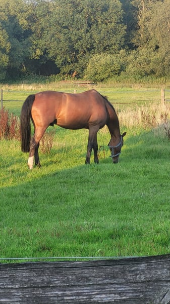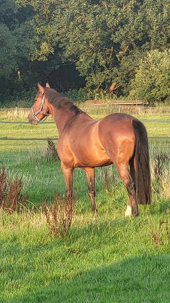 Wir bieten hier unseren Mecklenburger Wallach „Bumblebee“, bald 9 Jahre ( *Juni 2017) zum Verkauf an. Bambi ist ein hübscher, lernwilliger und sensibler, manchmal etwas guckiger Kerl, dabei durchaus leichtrittig. Er braucht einen Reiter zur Seite, mit genug Erfahrung, Selbstbewusstsein und der Fähigkeit, ihm die Sicherheit zu geben, die er braucht. Bambi hat Freude an der Arbeit, ist engagiert und immer bereit mitzumachen. Er zeigt sich sehr brav und lieb im Umgang, egal, ob beim Schmied, oder Tierarzt. Das Verladen zu uns verlief einfach und problemlos. Er ist voll geimpft, entwurmt und kommt alle 6 Wochen zum Schmied (Barhufer). In den Grundgangarten ist er gut ausgebildet. Er wurde hier dressurmäßig geritten. Eine AKU (mit Röntgenbildern) ergab einen leichten Augenbefund, der ihn aktuell nicht einschränkt. Der Tierarzt rät jedoch vom aktiven Springsport ab. Ansonsten ergab die AKU keine weiteren Befunde. Keine Koliken, keine Unverträglichkeiten, keine Allergien, kein Koppen oder sonstiges. Wir wünschen uns für Bambi ein schönes, liebesvolles Zuhause, mit regelmäßigem Weidegang und erfahrenen, ambitionierten Pferdemenschen. Wenn man ihn erreicht und sein Vertrauen gewonnen hat, wird er ein toller Partner werden, mit dem man freizeittechnisch viel Freude haben wird. Eine Turniervorstellung auf A – Niveau ist durchaus realistisch. Bei weiterhin kontinuierlichem arbeiten, auch auf L – Niveau. In der Herde zeigt er sich sehr gut verträglich mit anderen Wallachen. Videos und Probereiten auf Anfrage gerne möglich. Standort: 24558 Henstedt-Ulzburg Preis: 12.000 VB Telefon: 0173 610 11 99