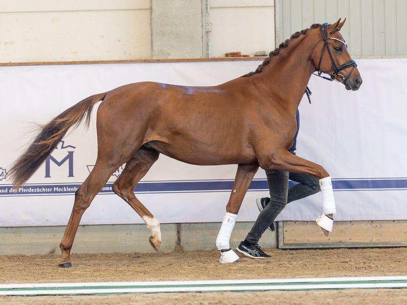 Floricello/Millennium/T./Weltfriede Dieser elegante, hochbeinige Fuchshengst mit seinem edlen, trockenen Gesicht und harmonischen Körperpartien besticht durch sein charmantes Auftreten. Seine imposante Galoppade mit viel Vorgriff und Durchsprung sowie sein raumgreifender Schritt lassen seine Perspektive als Dressurpferd erahnen. Vater Floricello war 2010 Reservesieger der Oldenburger Körung und wurde in Verden Vizeweltmeister der fünfjährigen Dressurpferde. Erfolgsdaten: V: Vizeweltmeister der 5jähr. DPF, DRE S* siegr.; 7 gekörte Söhne, NK siegr. und hochplatz. in Aufbauprüfungen bis WM junger DPF, NK bis intern. DRE GP erfolgr. u.a.: Lumiere (A. Zibrandtsen) M: DPF L siegr. MM: 6 sporterfolgr. NK u.a.: Sansolino (v. Samarant) DPF L/DRE M* siegr./DPF M/DRE M** erfolgr., Baroness 383 (v. Beltano) DPF L/DRE S* siegr., Donna Dilara 2 (v. Damsey) DPF L siegr./DRE L* erfolgr., De La Sol 2 (v. Dionysos) RPF siegr./DPF A erfolgr., Fürst Redefin (v. Fürst Jazz) DPF A erfolgr. MMM: 2 sporterfolgr. NK: Weltana 9 (v. Weltfriede) SPF 95cm/SPR L siegr./RPF/SPF 115cm/SPR 125cm erfolgr. Hannoveraner Stutenstamm 2190909 (Judruna) gekörte Hengste: Guenstling (v. Gruss), Donatello (v. Dollarprinz) erfolgr. Springpferde: AFP’s Cosmic Blue (v. Chacco-Blue) SPR intern. 160cm erfolgr., Cesaro 7 (v. Canturano I) SPR 145cm erfolgr., Samanta (v. Sandro Star) SPR intern. 140cm erfolgr., Clarissa 155 (v. Chess Cor) SPR intern. 150cm erfolgr., Quintendro (v. Quintender) SPR intern. 150cm erfolgr., Chickaboo (v. Chaccomo) SPR intern. 150cm erfolgr. https://horse24.com/de/auctions/details/5-mecklenburger-koertage-online-auktion-454 Ansprechpartner Jannes Sonnenberg 01705417431