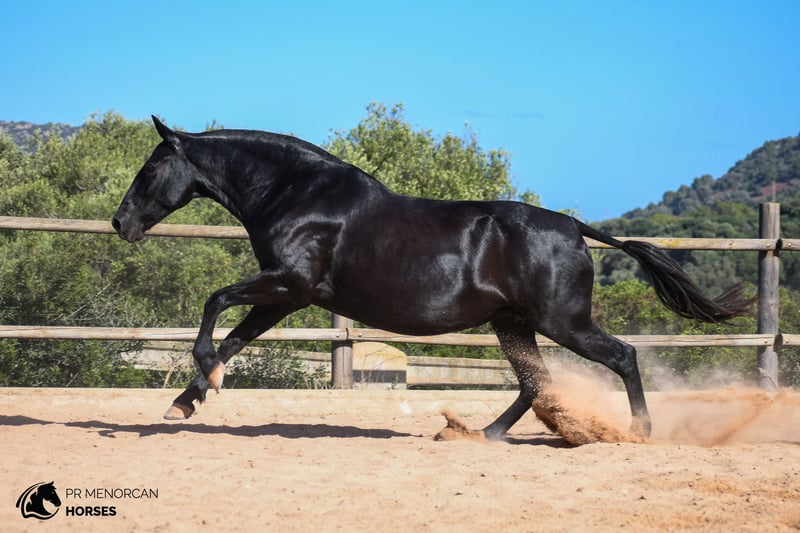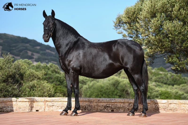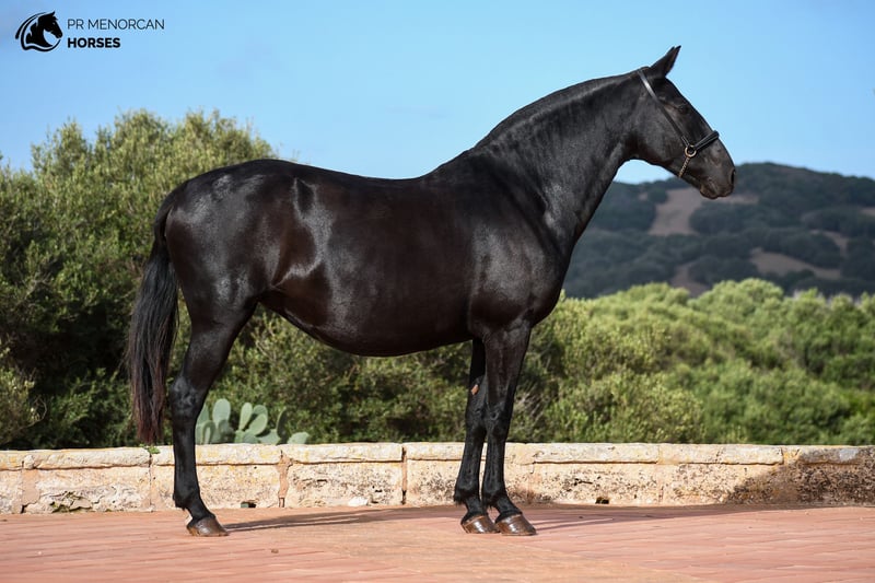 e present this gorgeous 2016 Purebred Menorcan mare, jet-black except for a small white sock on her left hind leg. Standing at 157 cm, she has a robust build and comes from a prestigious lineage featuring breed champions, making her a fantastic option as a broodmare with promising genetics for high-quality offspring. She is in foal to a beautiful big stallion with awards for his morphology and movements (see last picture) With her compact frame, strong legs, and graceful movement, she’s not only a breeding prospect but could also excel driving, working equitation, or simply as an enjoyable trail companion. Menorcan horses are known for their versatility, and this mare perfectly embodies that flexibility. This mare has a calm yet sensitive nature and is fully halter trained, can lunge, is good with the farrier, and loads smoothly onto a trailer. Raised in a paddock with other fillies her age, she’s well-socialized and has a steady, cooperative temperament. Regularly dewormed and fully prepared for her new journey. We handle all necessary documentation and offer worldwide transport. The purchase process can be done online, and we welcome and organize vet exams. Contact Us for More Information and Videos Located in Menorca Cheers!