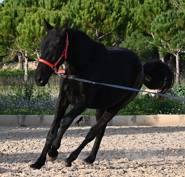 Esta yegua pura de raza Menorquina, nacida en 2024, es una joven y tranquila dama. No tiene tics de potro y realiza todo con mucha calma y serenidad. Como el propietario no pudo hacer trabajo de cancha debido a que los paddocks son enormes y están llenos de arbustos, la intentó linar dos veces antes de nuestra cita, y durante la grabación ya mostró un buen progreso. También al trabajar en la cuerda, mantiene su calma, y, como es típico de la raza Menorquina, incluso una bolsa de plástico para estimularla tuvo poca influencia ;) Por eso, seguramente será ideal para alguien que busque un caballo muy tranquilo, atento, de aprendizaje rápido y cariñoso. Existe la opción de dejarla en Menorca para su crianza, en caso de que no desees traerla de inmediato. Proviene de líneas muy antiguas de la raza Menorquina, y su delicada, fina y ligeramente cóncava cabeza cumple con los estándares de la raza. Además, al ser completamente negra, sin marcas blancas, aún más. Actualmente mide 1,52 m, por lo que seguramente superará las 1,60 m al final. Videos y pedigrí disponibles a petición. Su ubicación actual es Menorca. Con gusto puedo organizar una revisión de potros en la finca, transporte o incluso su viaje, si deseas visitarla en persona. Para más detalles, consulta mi página o contacta conmigo. Saludos desde España