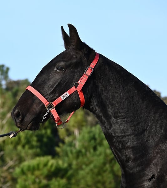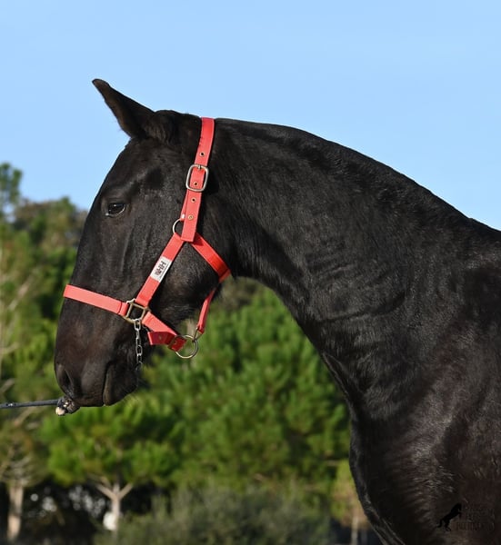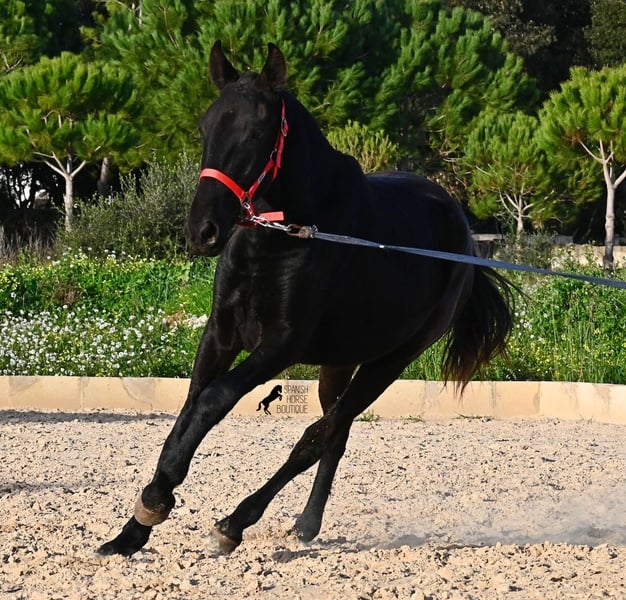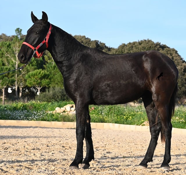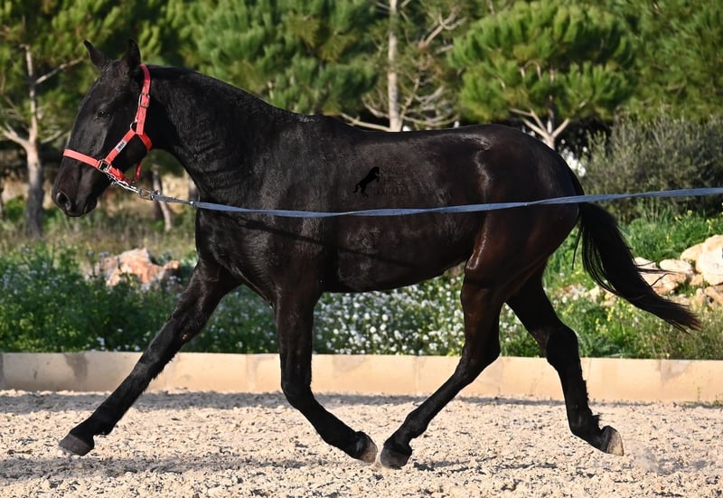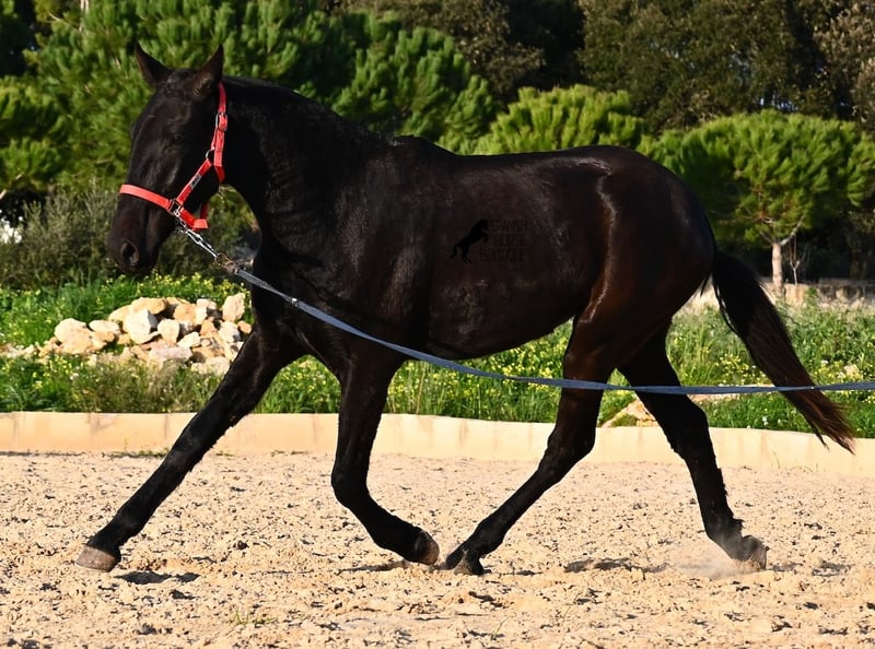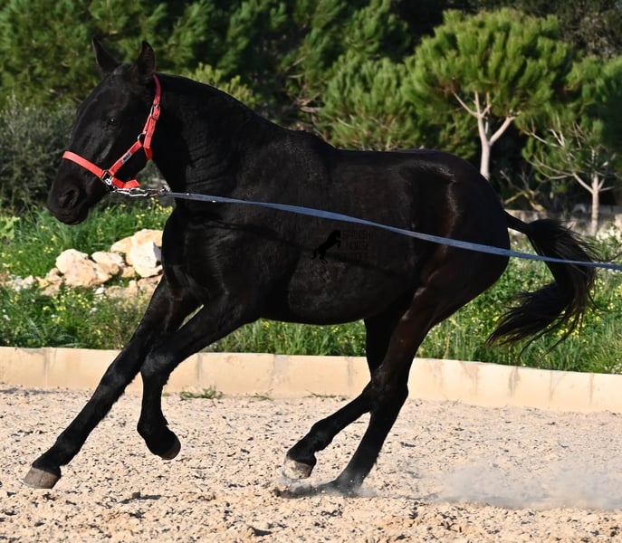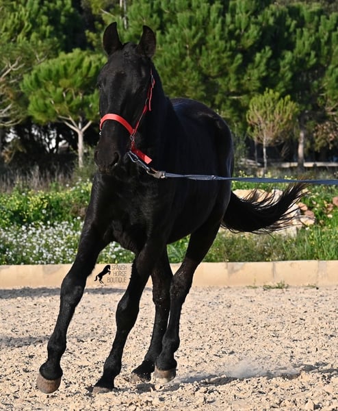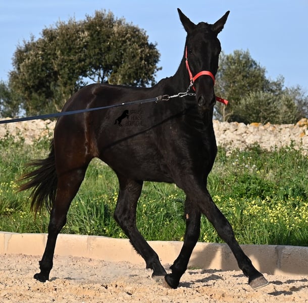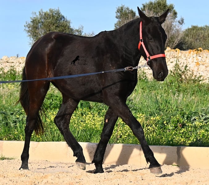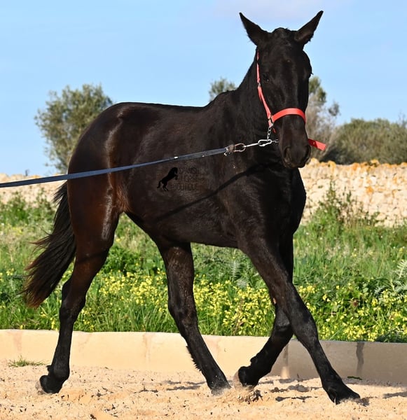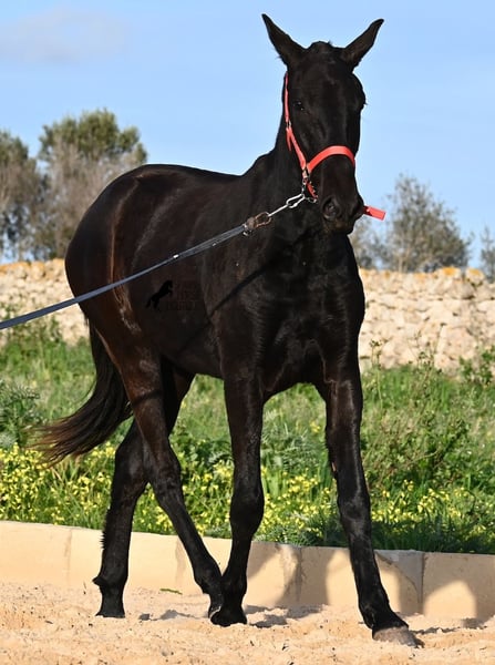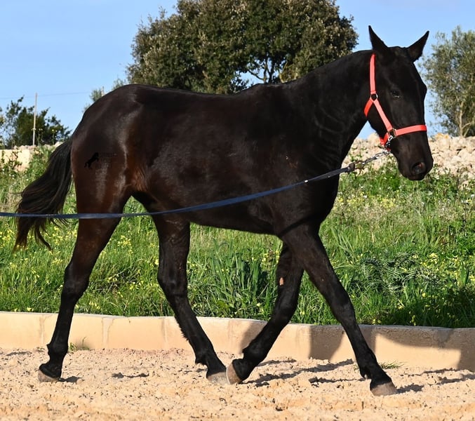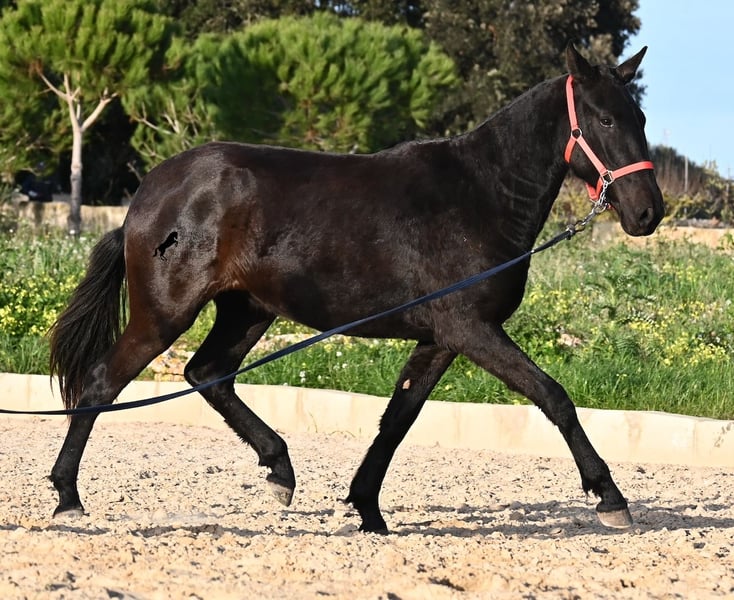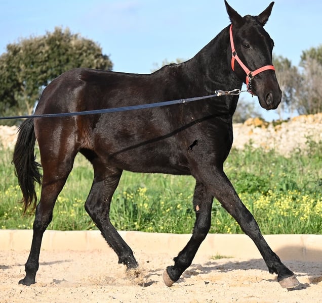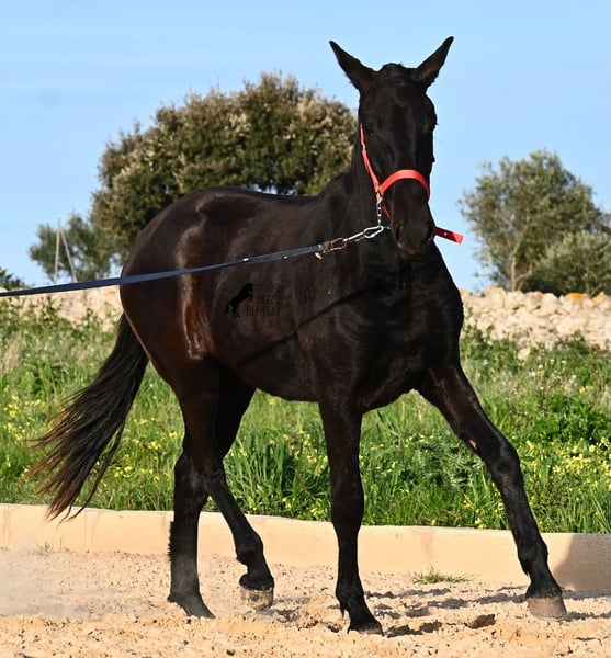 This purebred Menorquina mare, born in 2024, is a truly calm young lady! She has no foalish quirks and approaches everything very relaxed and with tranquility. Since her owner’s facilities are open and free-range turnout was not possible (the paddocks are large and full of bushes), he has tried to longe her twice—once before our appointment and during filming, and she already performed quite well. Even when longeing, she remains very calm, and true to her Menorquina nature, she was minimally affected by a plastic bag used for stimulation. ;) She will undoubtedly be ideal for someone seeking a very quiet, attentive, quick-learning, and loving horse! There is also the option to leave her on Menorca for further growth if you do not want to bring her home immediately. She descends from very old lines of the Menorquina breed, and her delicate, fine, slightly convex head aligns perfectly with the breed standard. The fact that she is completely black, without white markings, is even more remarkable! Currently, she measures 152 cm, so she will likely surpass the 160 cm final height. Videos and pedigree details are available upon request. Her current location is Menorca. I am happy to organize an on-site foal health check, transport, or her journey if you wish to come and see her in person. Please find more details on my website or contact me directly. Greetings from Spain