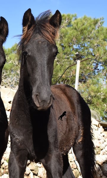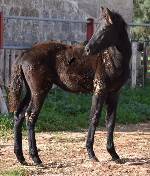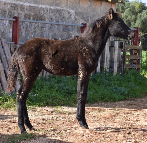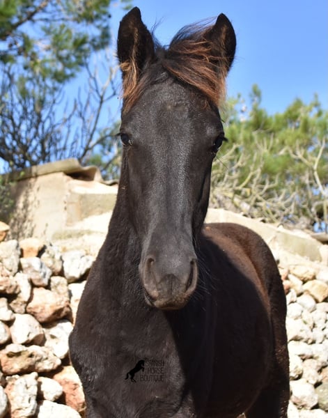 Born in the summer of 2024, this purebred Menorquin mare with full paper is a very cute young lady. She is completely black with no white markings and her dad is a multiple award winner for his awards in the local Doma Menorquina. Her paternal grandfather is one of the 3 elite stallions of the breed, with a lot of knee action, which has also come through in her. She is very compact and her expected final height is around 157cm. She is weaned together with her foal friend and is familiar with both the robust stall and the box. She is halter-trained and as her passport has already been issued, she is ready to move to her forever home. For today's steadily increasing price range of the Menorquin, she is also very affordable ;) If you want to get her later, a breeding place can be organized for her. Videos and pedigree on request. Her location is Menorca. I would be happy to organize a foal AKU on site, transport or even your trip, should you come to see her in person. Details can be found on my website or in conversation. Saludos from Spain