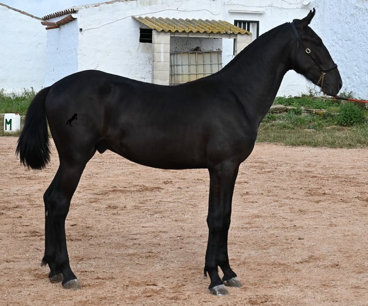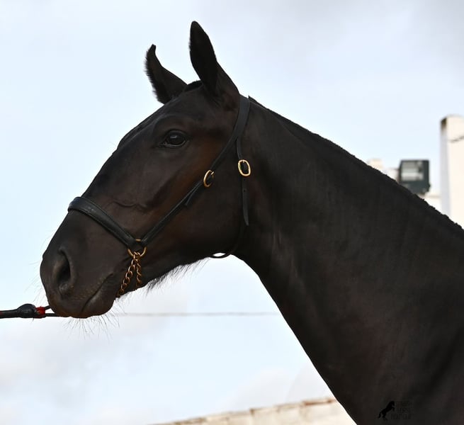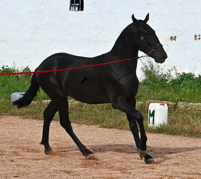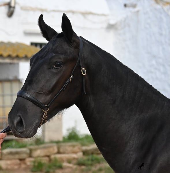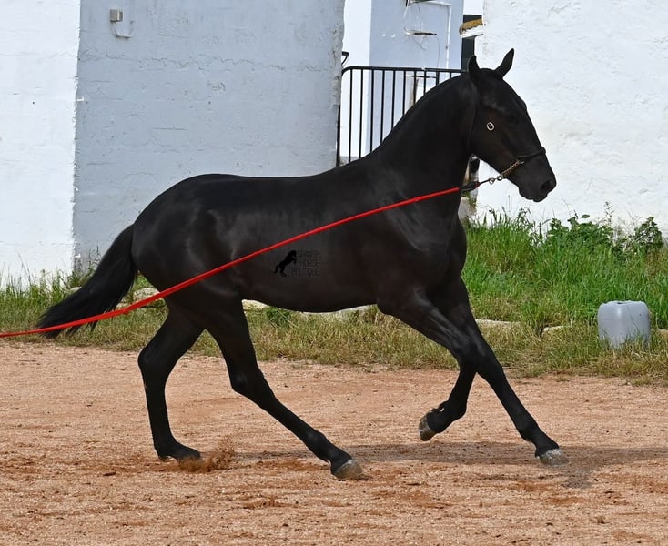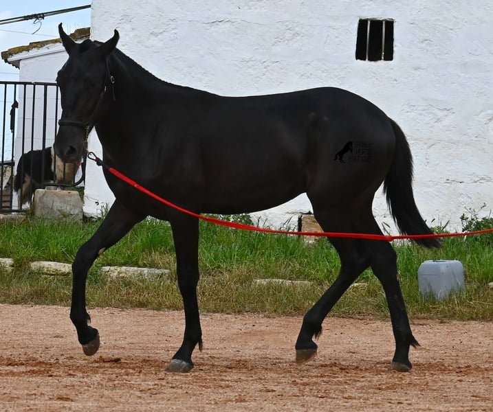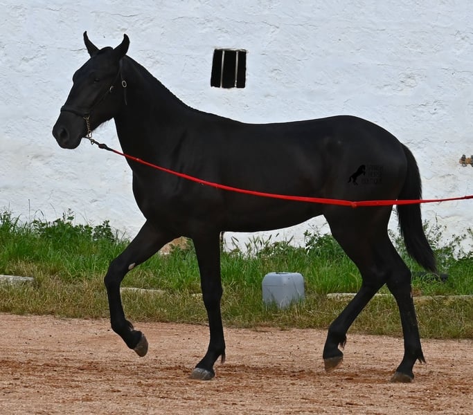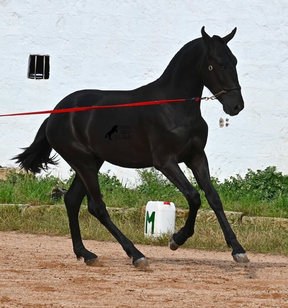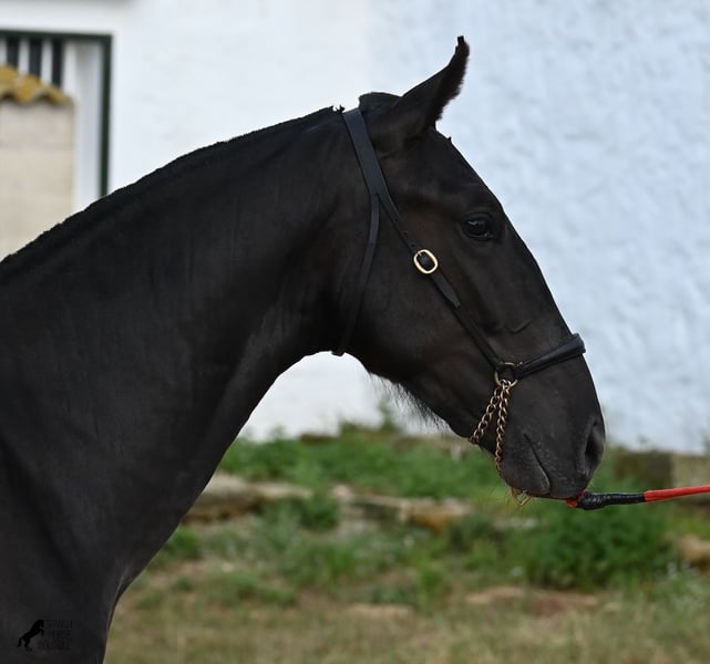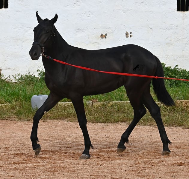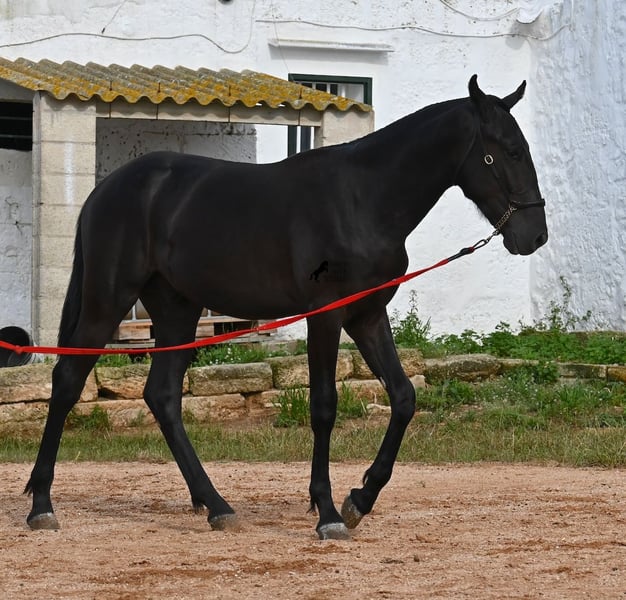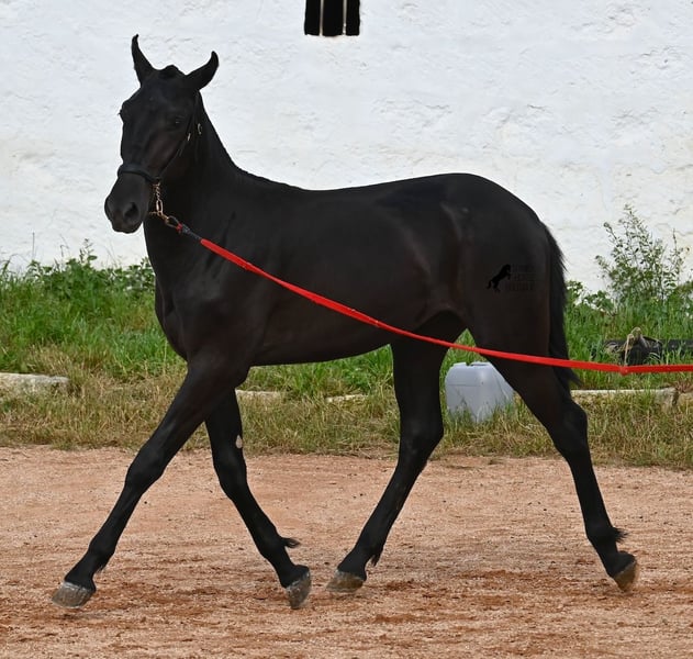 This purebred Menorquin stallion, born in spring 2024, is an absolute gem. As is typical for Menorquins, he is kept in a herd with 24-hour robust housing, and thanks to the rough climate and rocky terrain, he has good hoof quality, clean legs, and is as sure-footed as a mountain goat. ;) Noble blood flows through his veins, as his father has produced several breed champions, and on his mother's side, his grandfather is a Recomendado stallion, renowned for his excellent dressage performance. The young man is curious and is simply allowed to enjoy the horse life in the foal kindergarten. He knows how to be lunged in a halter and enjoys grooming, but is otherwise untrained. Later, he will be interesting both as a riding horse and as a driving horse, as Menorquins are very versatile! His expected final height is around 160 cm. Aside from some barely visible, isolated tick hairs on his head (which can hardly be called a star), he is completely black. If you wish to pick him up later, a breeding place can be organized for him. Videos and pedigree are available upon request. His location is Menorca. I would be happy to arrange a foal veterinary check, transport, or your trip if you wish to come and see him in person. Details can be found on my page or in conversation. Greetings from Spain!
