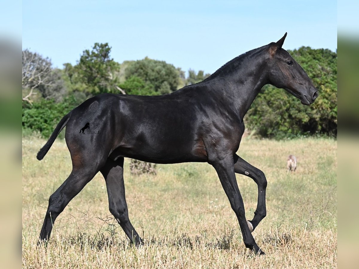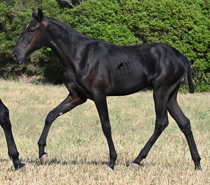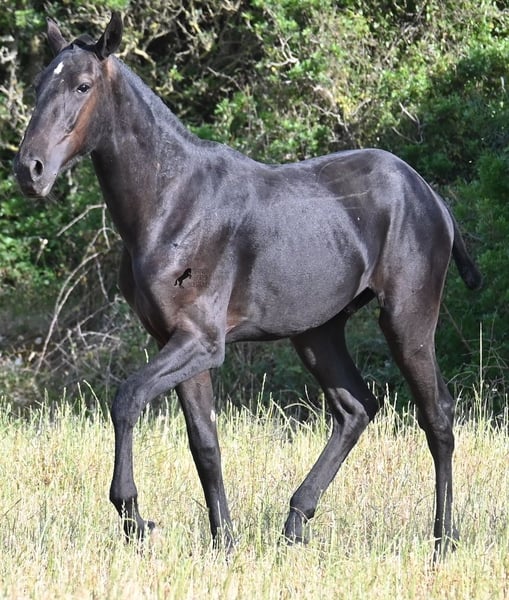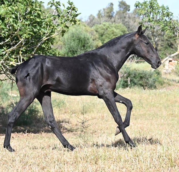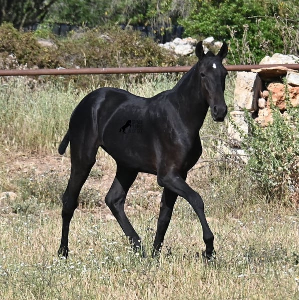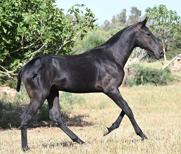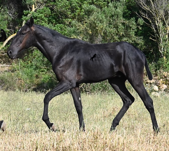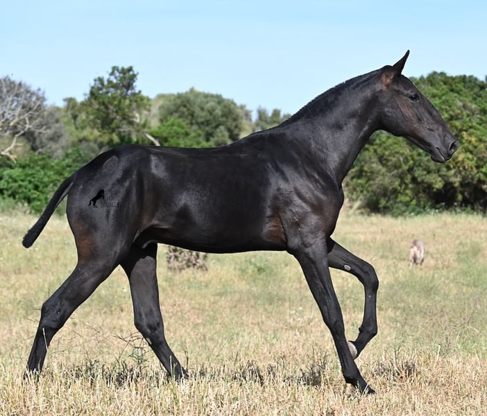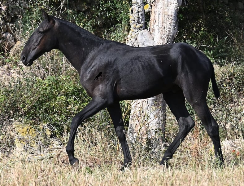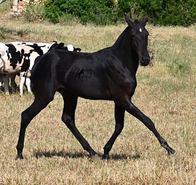 This purebred Menorquin stallion, born in spring 2024, is a truly affectionate and calm treasure! He has no young horse nonsense in his head—on the contrary! He prefers to cuddle, always wants to do everything right, and is incredibly calm for a young horse. If he continues like this, he will definitely become a real family horse! He is allowed to live in a robust environment with company, making him well-socialized and resilient. Not only does he master the basics of foal training with flying colors, but he has also been presented at a breeding show and is familiar with lunging in a halter and being in new places. He comes from old lines of the Menorquin, and his father is over 170 cm tall. His expected final height is around 163 cm, and apart from his sparkling star on his forehead, he is completely black. If you wish to pick him up later, a rearing place can be organized for him. Videos and pedigree are available upon request. His location is Menorca. I would be happy to organize a foal vet check, transport, or your trip if you would like to come see him in person. Details can be found on my page or in conversation. Greetings from Spain!