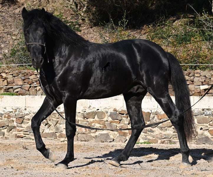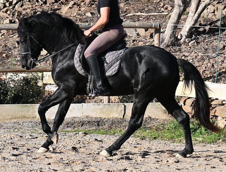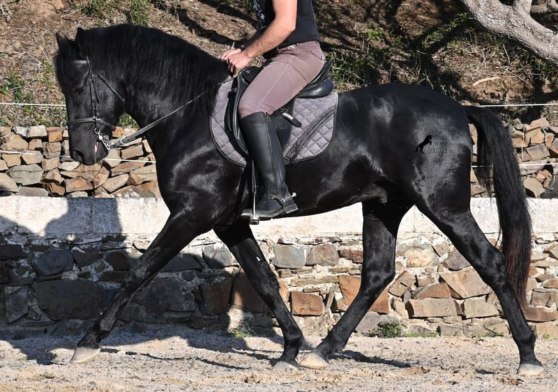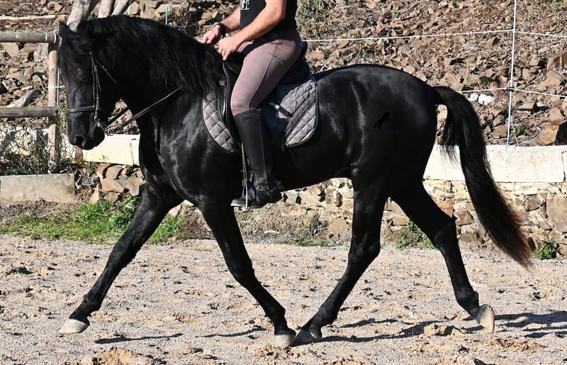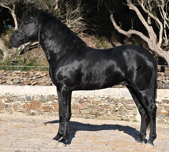 This 2022-born purebred Menorquín stallion is truly a heartwarming treasure. He is extremely affectionate, relaxed, and despite his young age, already a reliable riding horse under the saddle. This is a rare find, as one would expect playful antics from a horse of his age. Whether it’s tractors, trucks, construction sites, puddles, fire, or the sea, he passes everything calmly and without even flicking an ear (videos available!). Under the rider, he has a solid foundation and we are already working on cantering from the walk. Due to his calm and attentive nature, he learns very quickly. In the field, he is well-behaved and can go barefoot over very rocky terrain without any issues. On the long rein, he moves relaxedly in the arena, reflecting his good-natured character. He grew up in a herd of stallions in robust management, which has made him very well socialized. A few weeks ago, he was gelded, as the weather on Menorca became very adverse, and he is now being trained more regularly for sale. He is also very calm in handling, whether it’s grooming, picking up hooves, leading (past other horses), or saddling and bridling. He behaves as if he were much older, given his solid build. Since his height at the withers is 152 cm, which is below the minimum size for stallions, the breeder is offering him at a very favorable price! There is a possibility that he will still grow enough to be licensed later (minimum height 154 cm), but the breeder’s larger breeding goal remains a priority. On Menorca, stallions are traditionally used in fiestas, but since the veterinarian of the breeder states he has a subtle tone, the breeder prefers not to participate. He is classified as Class 1, meaning he can self-regulate as he gains more stamina! This does not affect his work in any way, and I have also made videos and audio recordings to share this. Due to this accumulation of small details, he is being offered at an EXTREMELY affordable price compared to today’s market value of Menorquín horses. For those who cannot or do not want to keep a stallion, castration on site is of course an option. A true treasure at a sensational price! Location: Menorca. Videos and pedigree available upon request. I am happy to organize an ultrasound, training, castration, transport, or even your journey if you come to see him in person. Details can be found on my website or in a personal conversation. Saludos from Spain