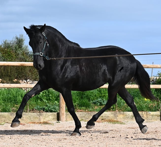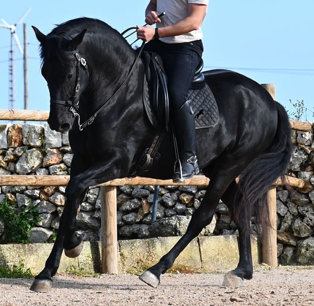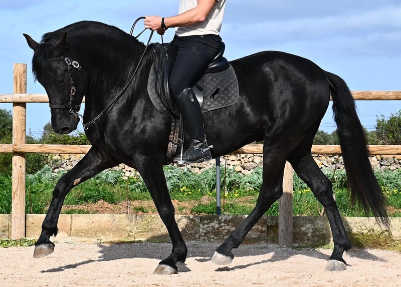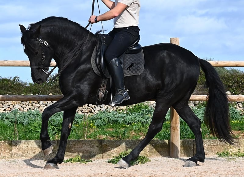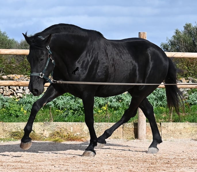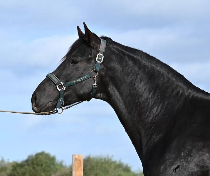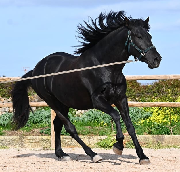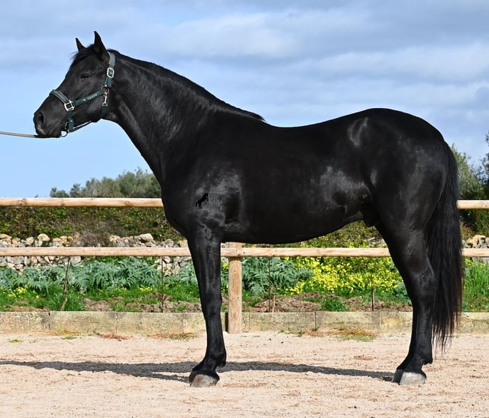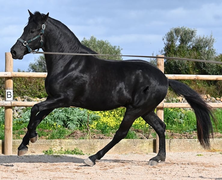Este semental de Menorquín nacido en 2021 es un hermoso ejemplar de raza con un estilo barroco. Y, como es el objetivo máximo de la cría, es completamente negro, sin marcas blancas, e incluso presenta las raras "manchas de leopardo" que brillan a través del pelaje. Con 5 años, aún no está completamente desarrollado (actualmente mide 1.62 m) y está en pleno crecimiento, ya que la grupa está ligeramente más alta en este momento. Hasta ahora, solo ha descendido un testículo, lo que lamentablemente lo excluye de la cría, ya que no puede ser inscripto en el studbook. El testículo no es palpable, por lo que una castración en el lugar no sería posible, ya que en Menorca no hay clínica especializada para ello, lo cual sería necesario dada la naturaleza de esta característica. Hasta los 3,5 años, este joven caballo creció libre en una manada de sementales y simplemente fue caballo, desarrollando sus habilidades sociales de manera óptima. Actualmente vive en un paddock con box grande y sus compañeros de establo con quienes creció. Este método de crianza y manejo se refleja en su carácter: es absolutamente tranquilo, muy respetuoso con las personas y, incluso si un pony le tira de la cola mientras lo cepillan, en el paddock cercano, ni siquiera mueve las orejas. Ha sido montado clásicamente en bocado con técnica inglesa y, hace algún tiempo, se adaptó a la Doma Menorquina, que se monta en una mano. Es tan bueno en ello que probablemente participará en concursos este año. Su movimiento es bonito y, a pesar de su apariencia barroca, es muy flexible y ágil, lo que también lo hace interesante para la Working Equitation. El paso español está en desarrollo y ya ha aprendido el típico BOT. Cuando está bajo la silla, se mantiene muy concentrado en el jinete y realiza todo con calma y serenidad. Como típico de Menorca, tiene una excelente calidad de casco y puede caminar sin problema sin herraduras. Es muy bien manejado y educado; en la cuerda (solo con cabestro de establo), muestra sus movimientos y flexibilidad con alegría de vivir, y bajo la silla, sorprende por su buen ritmo para un caballo de su edad. Su ubicación actual es Menorca. Videos y pedigrí disponibles a solicitud. Con gusto puedo organizar una revisión veterinaria en el lugar, entrenamiento, transporte o incluso su viaje, si desea venir a verlo personalmente. Para más detalles, puede consultar mi página o contactarme directamente. Saludos desde España