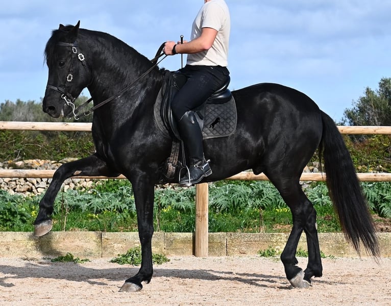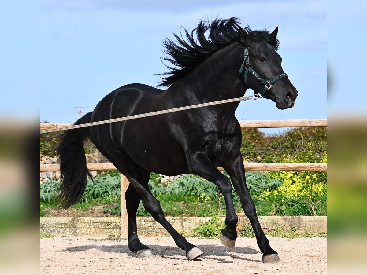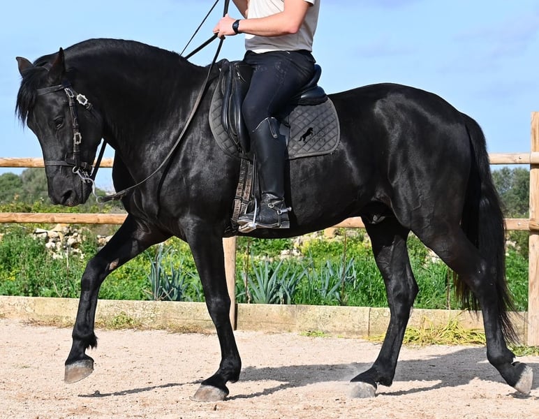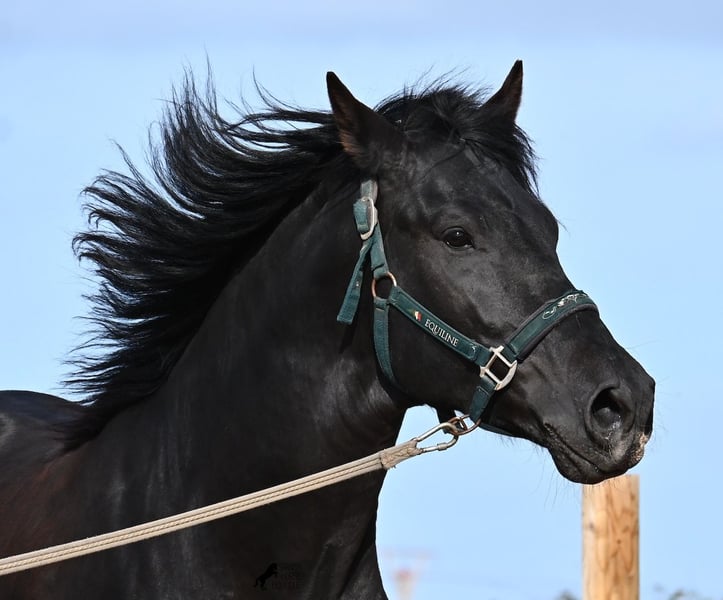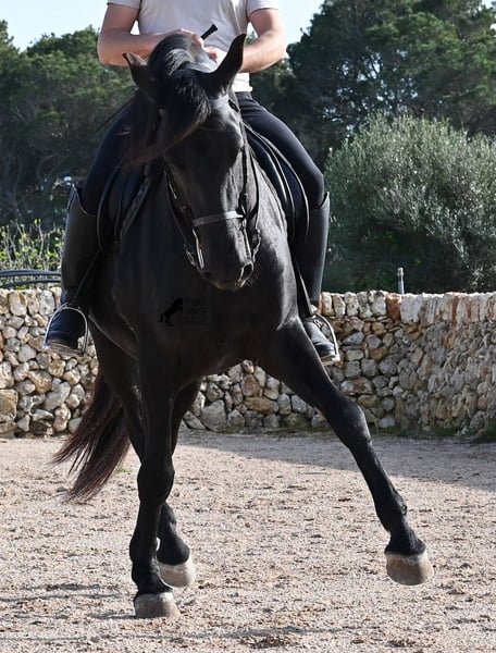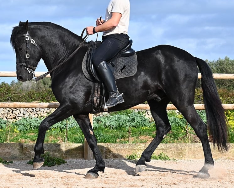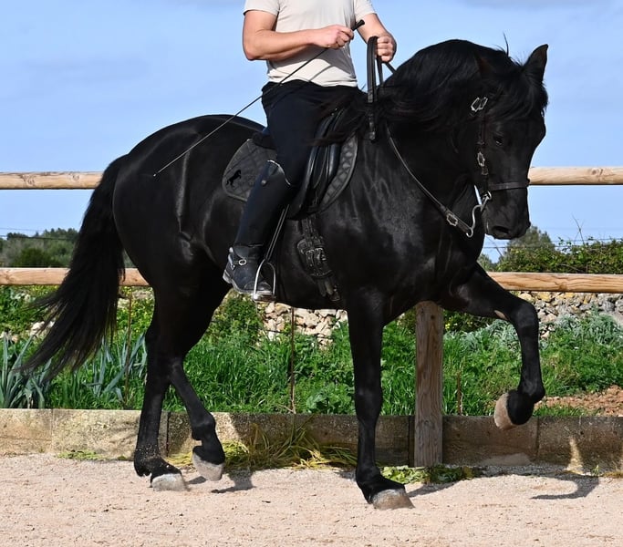 Este semental de Menorquín nacido en 2021 es un hermoso ejemplar de raza con un estilo barroco. Y, como es el objetivo máximo de la cría, es completamente negro, sin marcas blancas, e incluso presenta las raras "manchas de leopardo" que brillan a través del pelaje. Con 5 años, aún no está completamente desarrollado (actualmente mide 1.62 m) y está en pleno crecimiento, ya que la grupa está ligeramente más alta en este momento. Hasta ahora, solo ha descendido un testículo, lo que lamentablemente lo excluye de la cría, ya que no puede ser inscripto en el studbook. El testículo no es palpable, por lo que una castración en el lugar no sería posible, ya que en Menorca no hay clínica especializada para ello, lo cual sería necesario dada la naturaleza de esta característica. Hasta los 3,5 años, este joven caballo creció libre en una manada de sementales y simplemente fue caballo, desarrollando sus habilidades sociales de manera óptima. Actualmente vive en un paddock con box grande y sus compañeros de establo con quienes creció. Este método de crianza y manejo se refleja en su carácter: es absolutamente tranquilo, muy respetuoso con las personas y, incluso si un pony le tira de la cola mientras lo cepillan, en el paddock cercano, ni siquiera mueve las orejas. Ha sido montado clásicamente en bocado con técnica inglesa y, hace algún tiempo, se adaptó a la Doma Menorquina, que se monta en una mano. Es tan bueno en ello que probablemente participará en concursos este año. Su movimiento es bonito y, a pesar de su apariencia barroca, es muy flexible y ágil, lo que también lo hace interesante para la Working Equitation. El paso español está en desarrollo y ya ha aprendido el típico BOT. Cuando está bajo la silla, se mantiene muy concentrado en el jinete y realiza todo con calma y serenidad. Como típico de Menorca, tiene una excelente calidad de casco y puede caminar sin problema sin herraduras. Es muy bien manejado y educado; en la cuerda (solo con cabestro de establo), muestra sus movimientos y flexibilidad con alegría de vivir, y bajo la silla, sorprende por su buen ritmo para un caballo de su edad. Su ubicación actual es Menorca. Videos y pedigrí disponibles a solicitud. Con gusto puedo organizar una revisión veterinaria en el lugar, entrenamiento, transporte o incluso su viaje, si desea venir a verlo personalmente. Para más detalles, puede consultar mi página o contactarme directamente. Saludos desde España