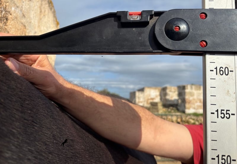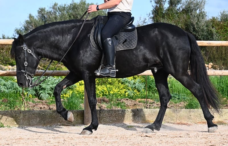Dieser 2021 geborene, reinrassige Menorquinhengst, ist ein schön barocker Rassevertreter. Und wie es das höchste Zuchtziel wünscht, komplett schwarz, ohne weiße Abzeichen und er hat sogar die seltenen "Leopardenflecken", die durchs Fell schimmern. Mit 5 Jahren ist er noch nicht ganz ausgewachsen (aktuell 162cm) und er ist auch gerade in einem Wachstumsschub, denn die Hinterhand ist gerade etwas höher ;) Ihm ist bisher nur ein Hoden heruntergekommen, was ihn leider aus der Zucht ausschließt, denn so wird er nicht angekört. Der Hoden ist nicht tastbar, was bedeutet, eine Kastration vor Ort, wäre in diesem Fall auch nicht möglich, denn auf Menorca gibt es keine Klinik, was nötig wäre, bei dieser Laune der Natur. Bis 3.5 Jahre durfte der Bursche komplett roh in der Hengstherde aufwachsen und einfach Pferd sein und seine Sozialkontakte bestens pflegen. Nun lebt er in einer großen Paddockbox und als Nachbarn hat er seine Kumpels, mit denen er großwerden durfte. Diese Aufzucht und Haltung macht sich bezahlt, denn er ist absolut tiefenentspannt, dem Menschen gegenüber sehr achtsam und selbst wenn ihm beim Putzen ein Pony am Schweif herumzupft, weil der Paddock neben dem Putzplatz ist, wackelt er nicht einmal mit den Ohren. Er wurde klassisch englisch auf Trense angeritten und vor einiger Zeit auf die örtlich typische Doma Menorquina umgestellt, die einhändig geritten wird. Dabei macht er sich so gut, dass er dieses Jahr vermutlich schon auf Turniere gehen wird. Seine Bewegung ist schön und trotz des barocken Exterieurs, ist er sehr biegsam und geschmeidig, was ihn auch für die Working Equitation interessant macht! Der spanische Schritt ist angefangen und auch den typischen BOT hat er bereits gelernt. Ganz konzentriert ist er permanent beim Reiter, wenn er unterm Sattel ist und macht alles mit Ruhe und Gelassenheit. Typisch Menorquin hat er super Hufqualität und läuft daher problemlos barhuf. Im Händling ist er super und sehr erzogen, an der Longe (nur Stallhalfter!) präsentiert er seine Gänge und Flexibilität mit Lebensfreude und unterm Sattel ist er erstaunlich gesetzt für ein Pferd in seinem Alter. Sein Standort ist Menorca. Videos und Abstammung gerne auf Anfrage. Gerne organisiere ich vor Ort eine AKU, Beritt, Transport oder auch ihre Reise, sollten Sie persönlich zum Anschauen kommen. Details dazu gerne auf meiner Seite oder im Gespräch. Saludos aus Spanien