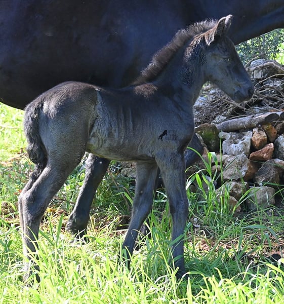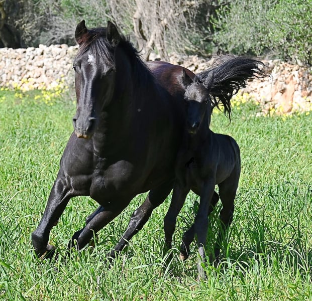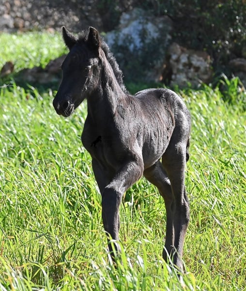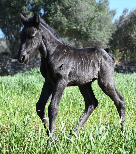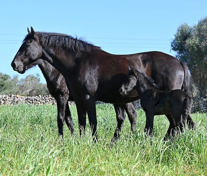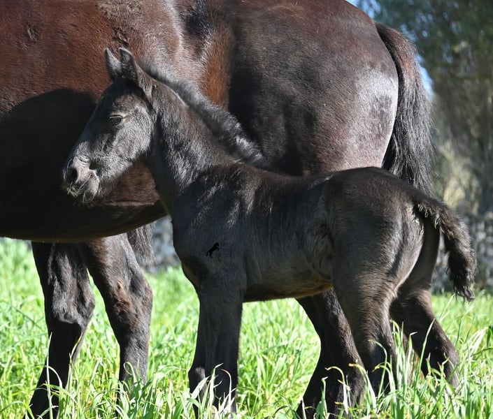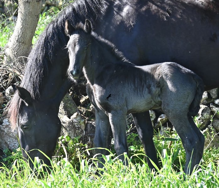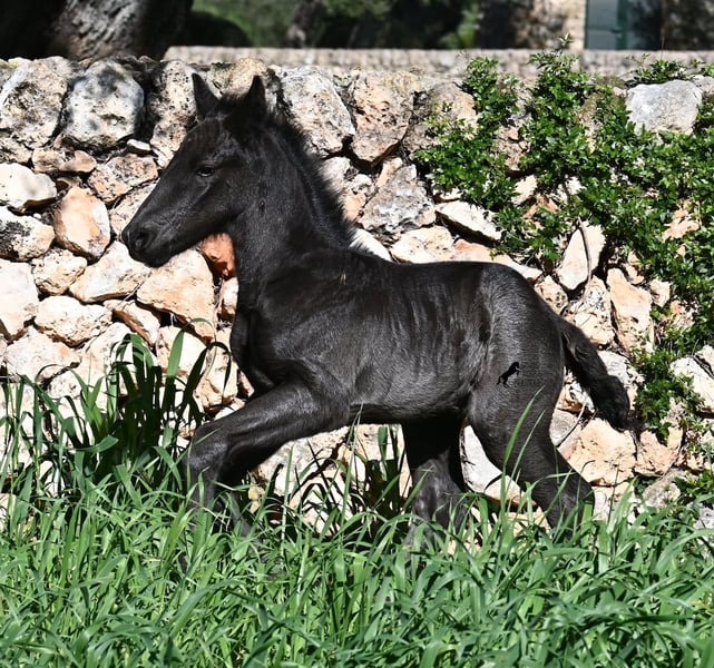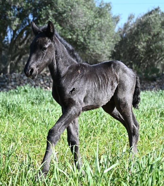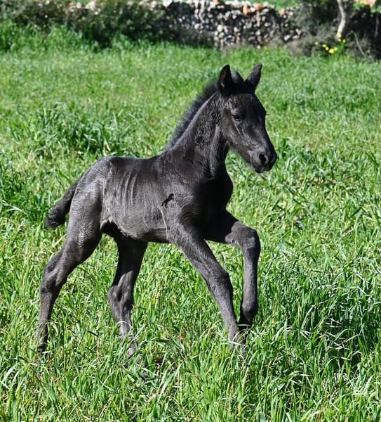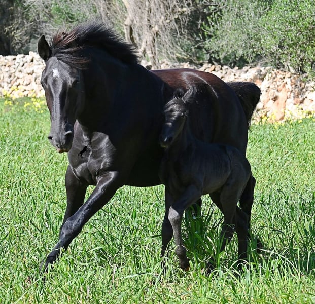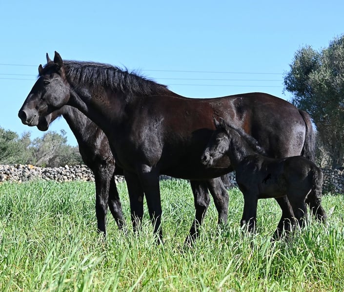 During a fierce storm, this Menorquín foal decided to come into the world. After all, one wants to become a sturdy representative of the breed ;) His sire stands over 170 cm and carries both Malboro and Nonte bloodlines! His dam is a Recomendado mare with Rostoll and Telma in her pedigree. Because he has a small white star and a subtle white marking on his hind leg, he is unique among the mostly black Menorquín foals. Since not all foals can stay, a forever home is sought for him! He is growing up perfectly, spending 24 hours a day outside on lush grass, which provides his mother with good milk. Thanks to the tough soils of Menorca and his 24-hour robust upbringing, he has excellent hooves and clear legs. He is already quite hardy, having endured a record winter with harsh weather—if it’s not pouring, then it’s storming! I sell the foal as follows: contract signing plus a deposit, after which you can choose his name (before the federation’s deadline). This year’s letter is T. Once the papers are issued, the second payment is due after successful weaning, followed by the third and final payment. The price includes official Menorquín registration, passport, and EU chip, with care until weaning. His current price is €3,500 (payable in three installments). Once weaned, I will organize transportation or there is the option of a rearing place on Menorca.