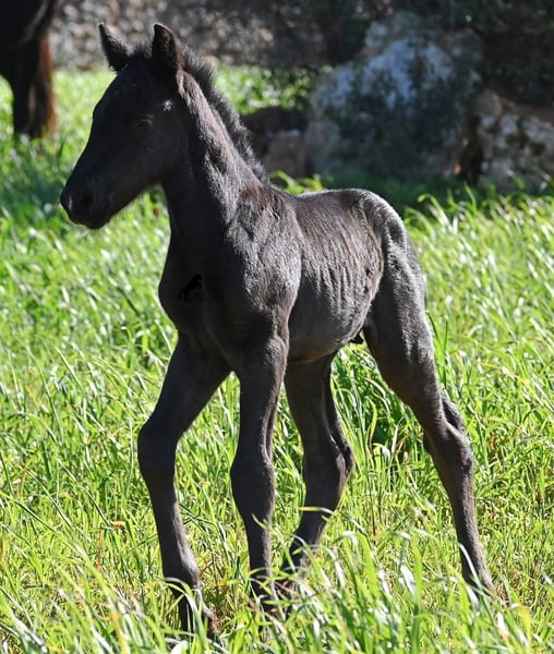Während eines ganz heftigen Unwetters, hat dieses Menorquinhengstfohlen beschlossen, auf die Welt zu kommen. Man will ja schließlich ein robuster Rassevertreter werden ;) Sein Papa Ist über 170cm groß und hat sowohl Malboro, als auch Nonte Blut in sich! Die Mama ist eine Recomendado Stute mit Rostoll und Telma in der Abstammung! Da er eine kleine weiße Schnippe hat und dezent weiß am Hinterlauf, ist er einzigartig unter den sonst ganz schwarzen Menorquin. Da nicht alle Fohlen immer bleiben können, wird für ihn ein Für-Immer-Zuhause gesucht! Er wächst ideal auf, nämlich 24h draußen im saftigen Gras, was Mama gute Milch geben lässt. Dank der harten Böden auf Menorca und der 24h Robusthaltung, bekommt er tolle Hufe und klare Beine. Abgehärtet ist er jetzt schon, denn wir haben einen Rekordwinter was schlechtes Wetter betrifft und wenn es nicht schüttet, dann stürmt es! Die Fohlen verkaufe ich folgendermaßen: Vertragsabschluss + Anzahlung, du kannst dann den Namen wählen (vor der Deadline des Verbandes). Dieses Jahr ist Buchstabe T. Wenn die Papiere ausgestellt sind, die 2. Zahlung Nach dem erfolgreichen Absetzen, die 3. und letzte Zahlung. Inklusive offiziellem Menorquinpapier mit Pass und EU Chip, Unterhalt bis Absetzen ist sein Preis aktuell 3.500€ (zahlbar in 3 Teilen) Wenn er abgesetzt ist, organisiere ich den Transport oder es besteht die Möglichkeit auf einen Aufzuchtsplatz auf Menorca.