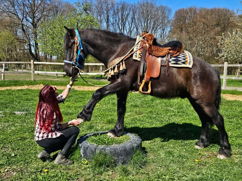 Zum Verkauf steht ein junger Merenswallach (geb. 2022) mit viel Charme und einer ansprechenden, dunklen Farbgebung Er bringt einen kräftigen, kompakten Körperbau mit und zeigt sich im täglichen Umgang freundlich, ausgeglichen und sehr menschenbezogen. Unter dem Sattel ist er bereits geritten und präsentiert sich dabei zuverlässig sowie gelassen. Auch im Gelände macht er einen guten Eindruck und bleibt sowohl alleine als auch in der Gruppe ruhig und brav. Seine Haltung in Offenstallhaltung ist ihm vertraut, was er problemlos annimmt. Insgesamt ein vielseitiger junger Wallach mit solider Grundlage und viel Entwicklungspotenzial – ideal für Freizeit und weitere Förderung. Pflege & Betreuung: – Regelmäßig entwurmt – Schmied gepflegt – Osteopathisch betreut Zusatzangebote: Westernsättel, Trensen und weiteres Zubehör erhältlich. Service: AKU dabei , stm. 1,56 E-Paß 7400,- – Transport kann organisiert werden – 3 Monate Umtauschrecht Proberitt: – 35 € (jedes weitere Pferd 25 €) – Wird beim Kauf am selben Tag angerechnet Preisnachlass bei sofortiger Mitnahme oder Transport am gleichen Tag: – Kategorie 1: 100 € – Kategorie 2 (ab 5.000 €): 250 € Telefon: 0171 – 4001968 Täglich erreichbar von 8–20 Uhr Keine E-Mail oder WhatsApp Alle Angaben ohne Gewähr